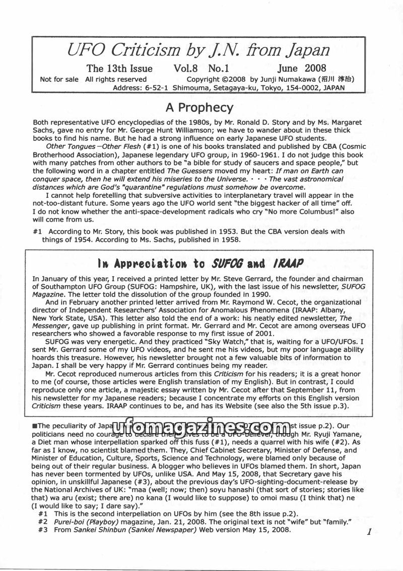 This issue of 'UFO Criticism by J.N. from Japan' features a prophecy about extending human miseries to the universe if space is conquered. It notes the dissolution of the Southampt