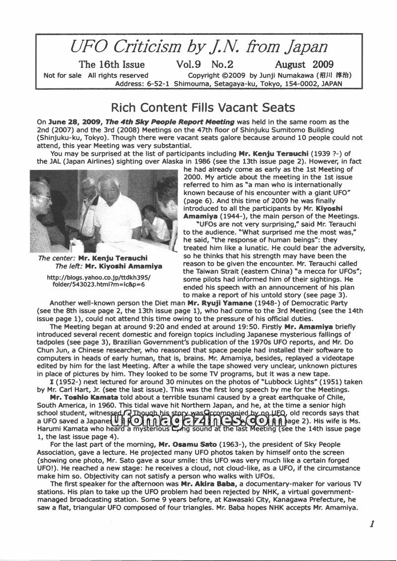 The 16th issue of 'UFO Criticism by J.N. from Japan' (August 2009) details the 4th Sky People Report Meeting held in Tokyo. Key speakers included Kenju Terauchi, who shared his exp