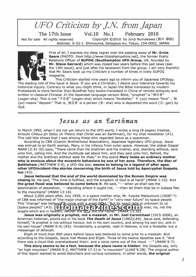 This issue of 'UFO Criticism by J.N. from Japan' explores the theory that Jesus was an earthman, possibly a spaceman, rather than a divine messiah. The author examines biblical acc