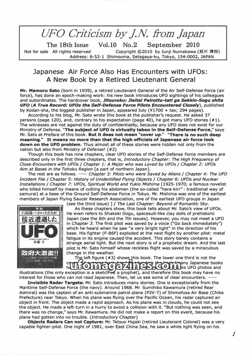 This issue reviews 'A True Record: UFOs the Self-Defense Force Pilots Encountered Closely,' a book by retired Lieutenant General Mamoru Sato. The book details UFO sightings by Japa
