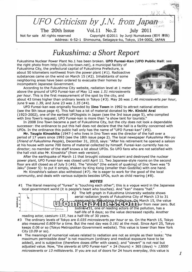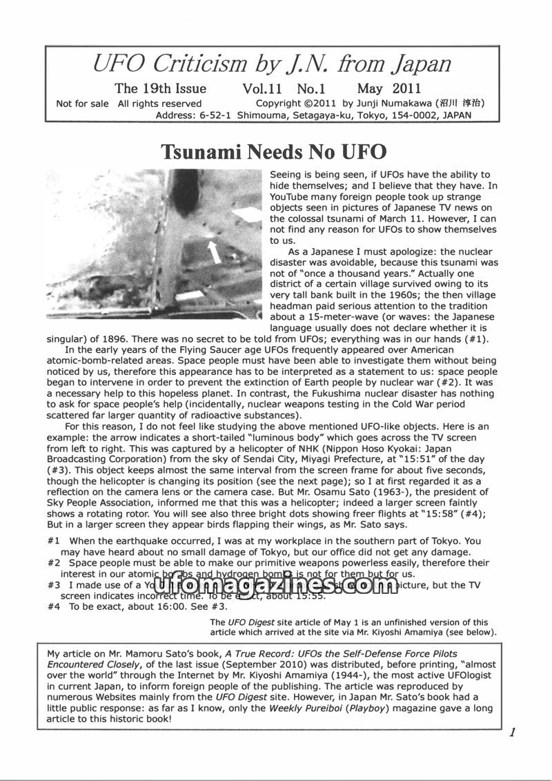 This issue of 'UFO Criticism by J.N. from Japan' argues that UFOs were not relevant to the 2011 Japanese tsunami or the Fukushima nuclear disaster, suggesting past UFO appearances