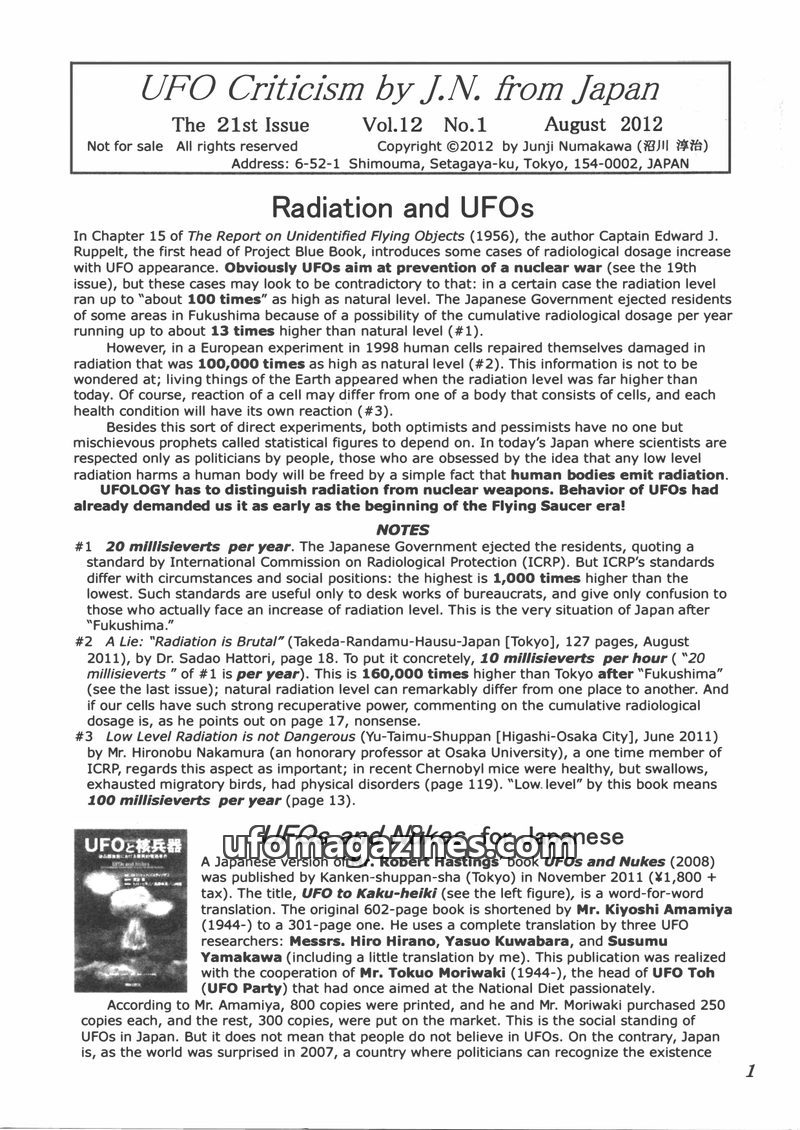 This issue of 'UFO Criticism by J.N. from Japan' delves into the connection between UFOs and nuclear weapons, referencing a 1954 UK radar incident and a 1965 sighting by the CBA. I
