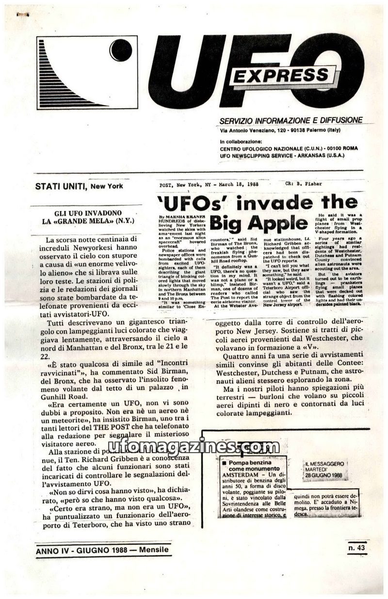 This issue of UFO Express from June 1988 covers a wide range of UFO-related topics. A lead story details a mass sighting of a triangular craft over New York City. Several articles
