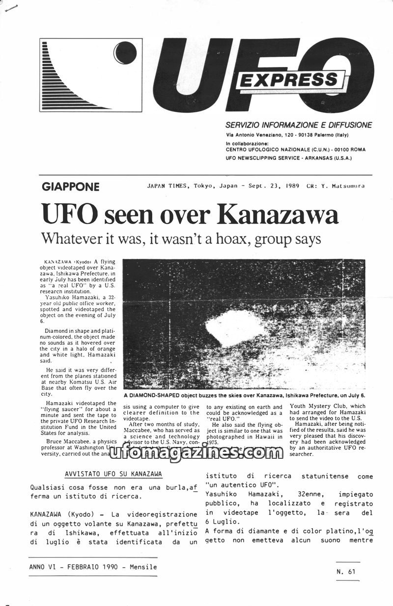 This issue of UFO Express details a UFO sighting over Kanazawa, Japan, identified as a 'real UFO' by a US research institution after analysis of a videotape. It also covers a repor
