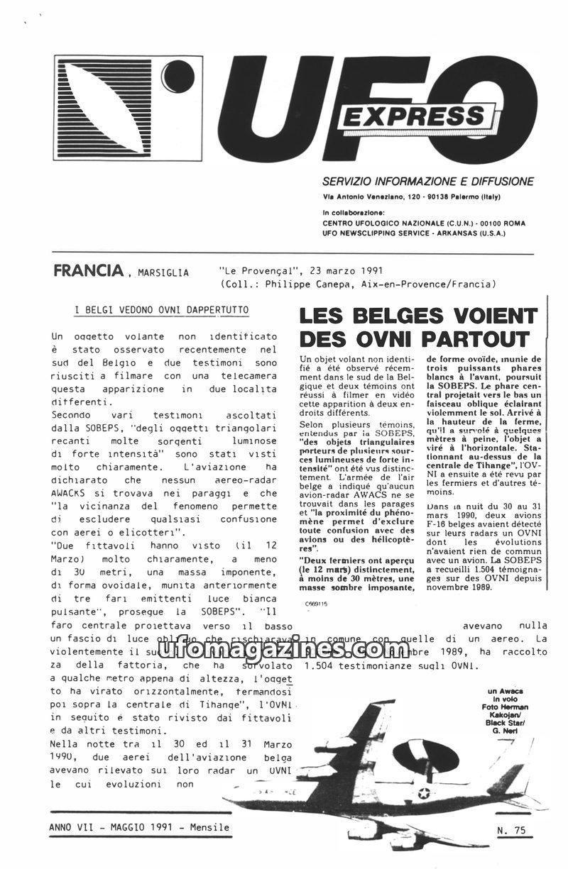 This issue of UFO Express covers multiple UFO sightings and related phenomena. A report from Belgium details sightings of triangular and oval craft, including radar detection by F-