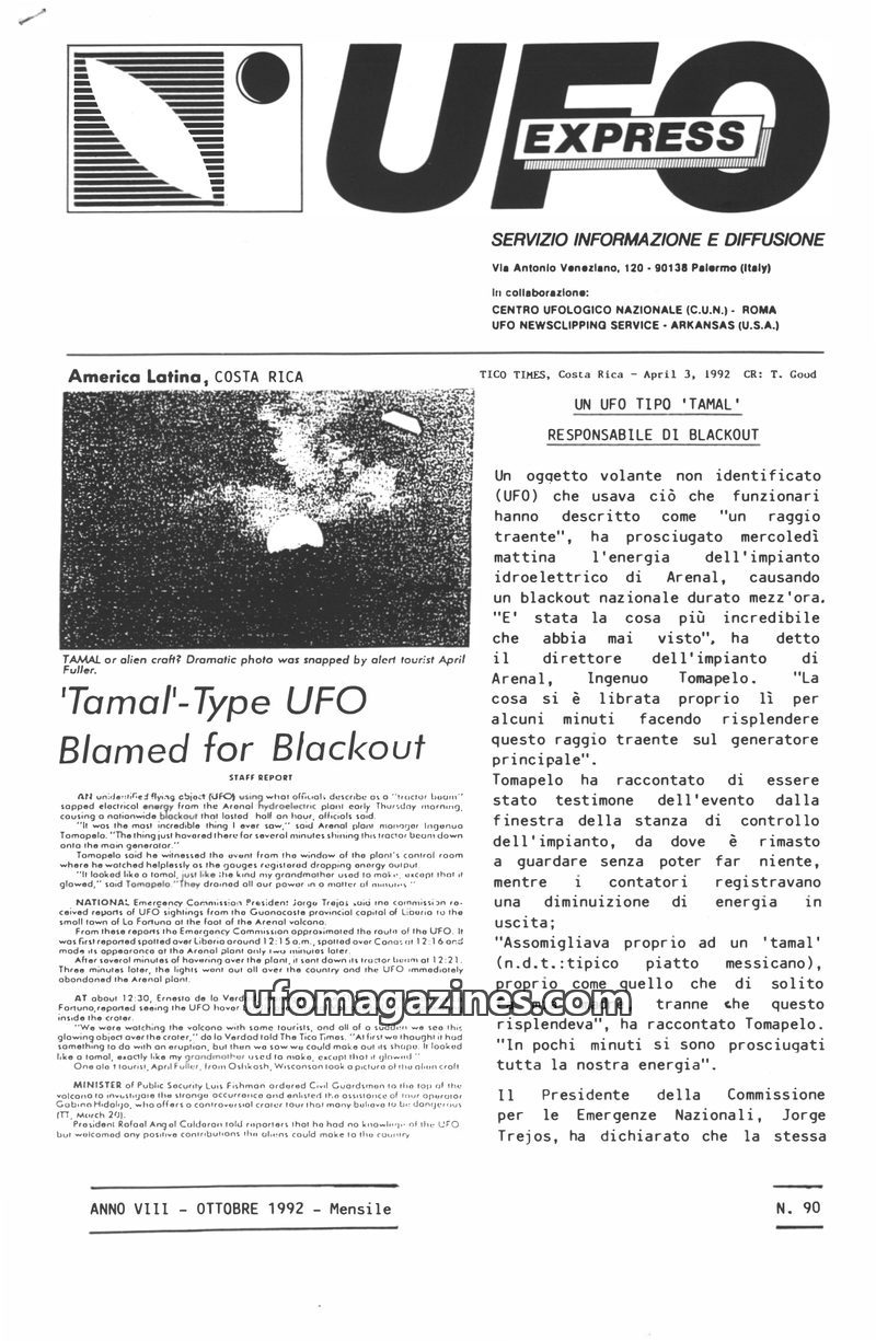 This issue of UFO Express details a UFO incident in Costa Rica where a 'tamal'-type craft allegedly caused a nationwide blackout by draining energy from a hydroelectric plant. It a