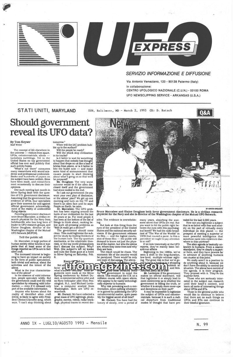 This issue of UFO EXPRESS delves into several intriguing topics. A central debate focuses on whether governments should reveal their UFO data, with proponents like Bruce Maccabee a