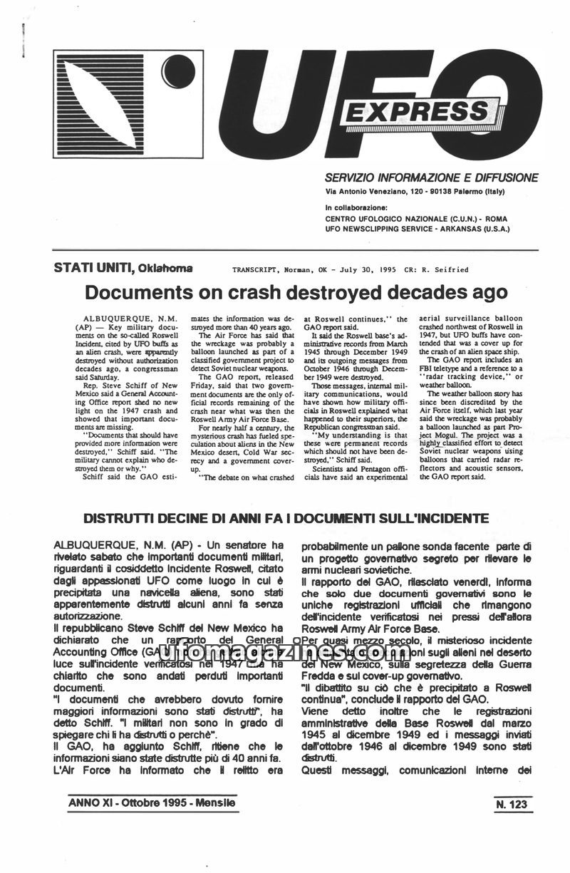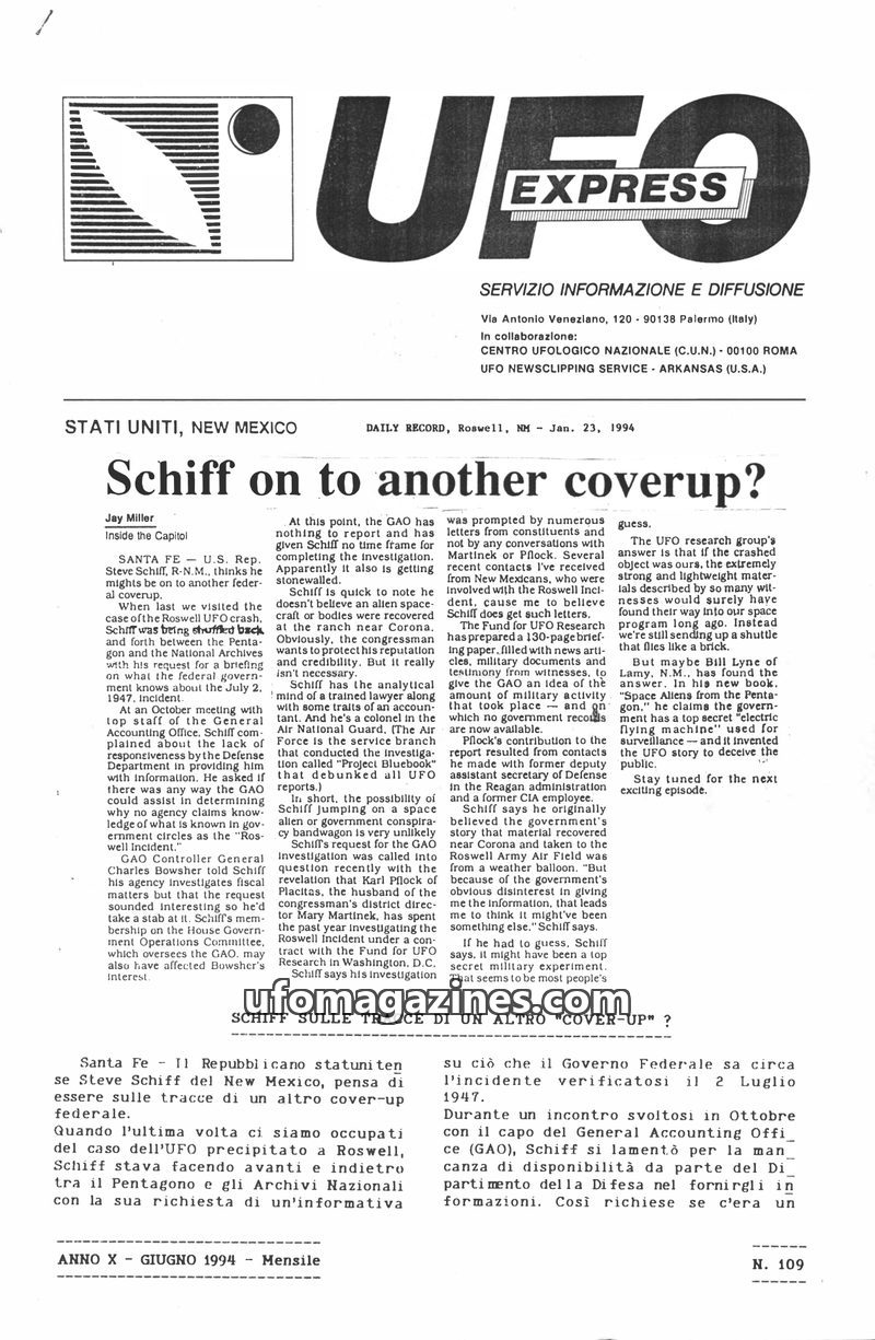 This issue of UFO Express focuses on the ongoing investigation by U.S. Congressman Steve Schiff into the Roswell UFO incident, suggesting a potential government cover-up. It also i