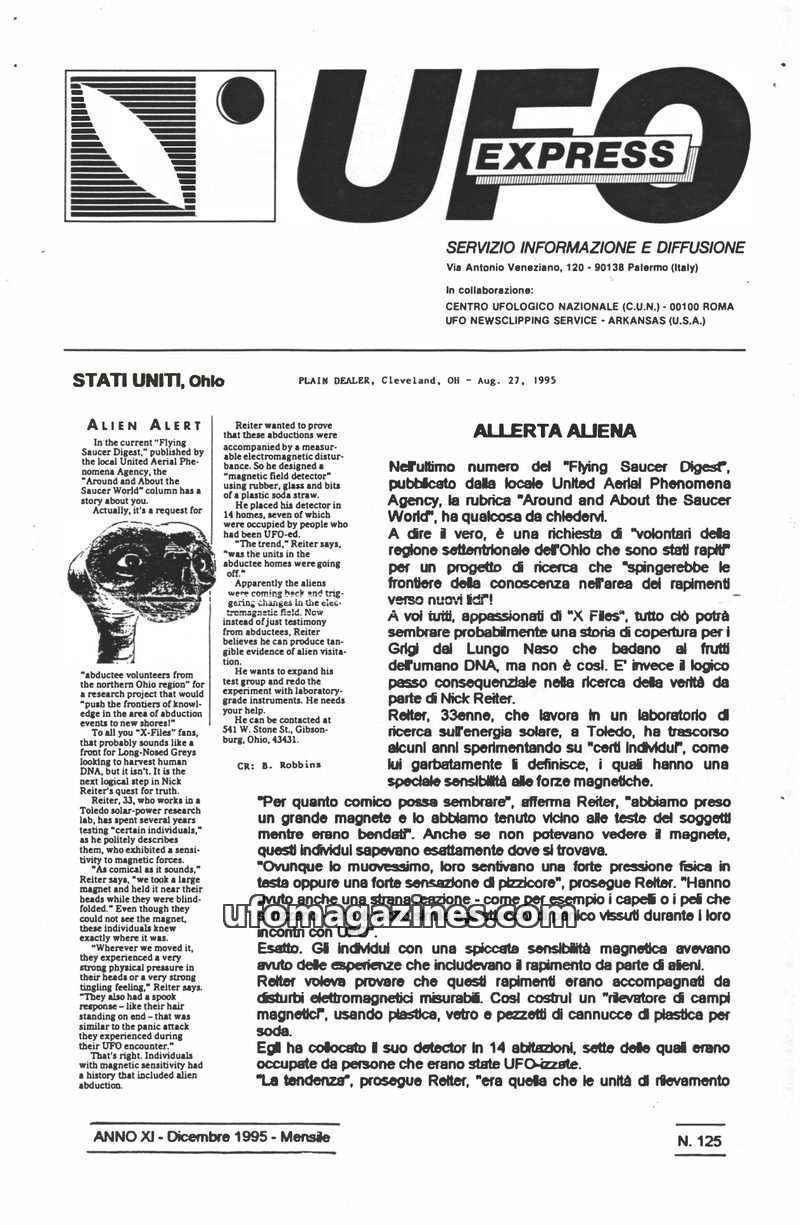 This issue of UFO Express (December 1995) highlights a variety of UFO sightings and related phenomena. In Ohio, researcher Nick Reiter seeks abduction volunteers to study magnetic