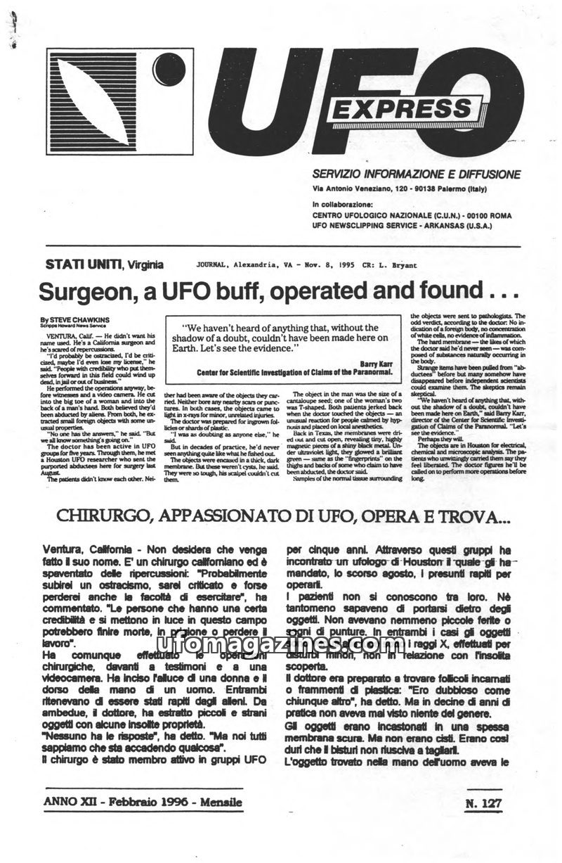 This issue of UFO Express covers a range of UFO-related topics. A California surgeon extracted unusual objects from alleged alien abductees, sparking debate about extraterrestrial