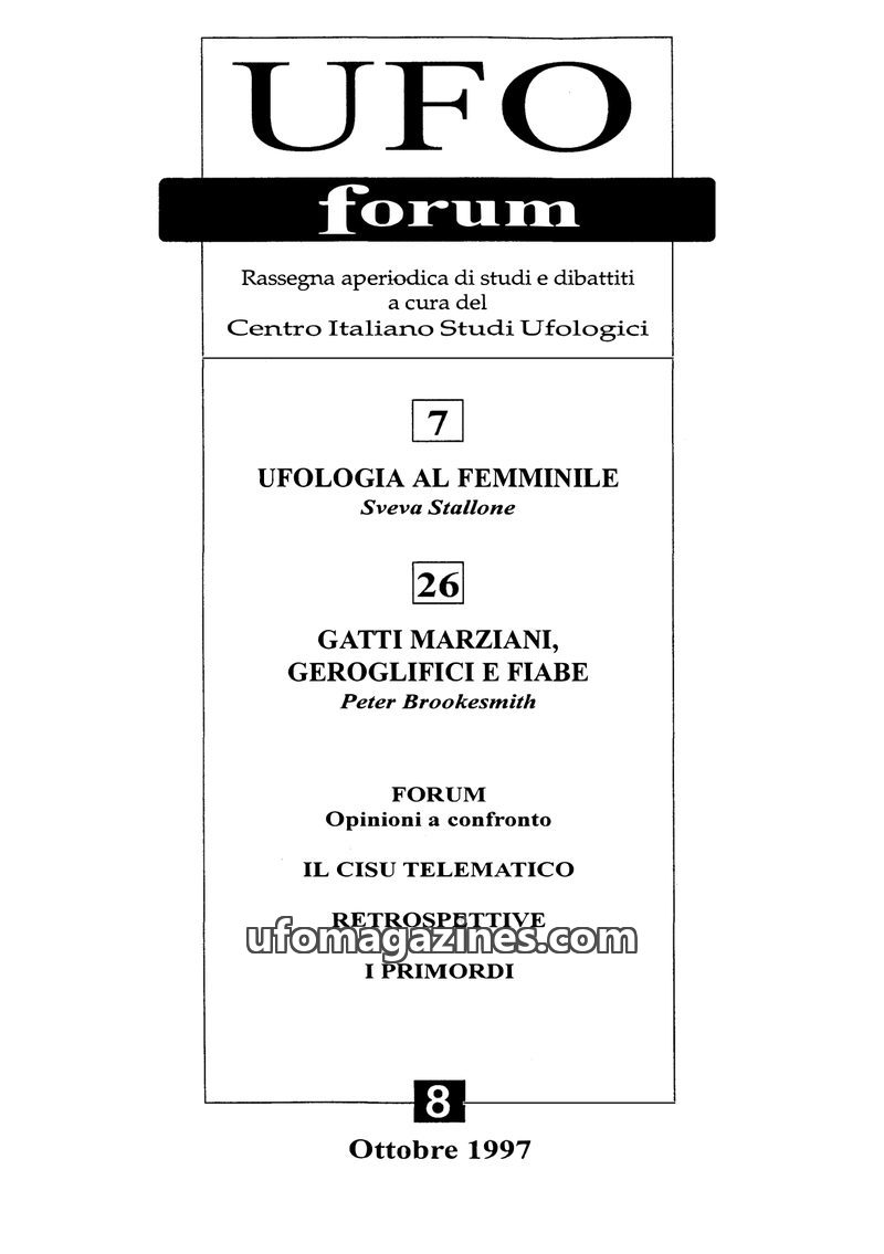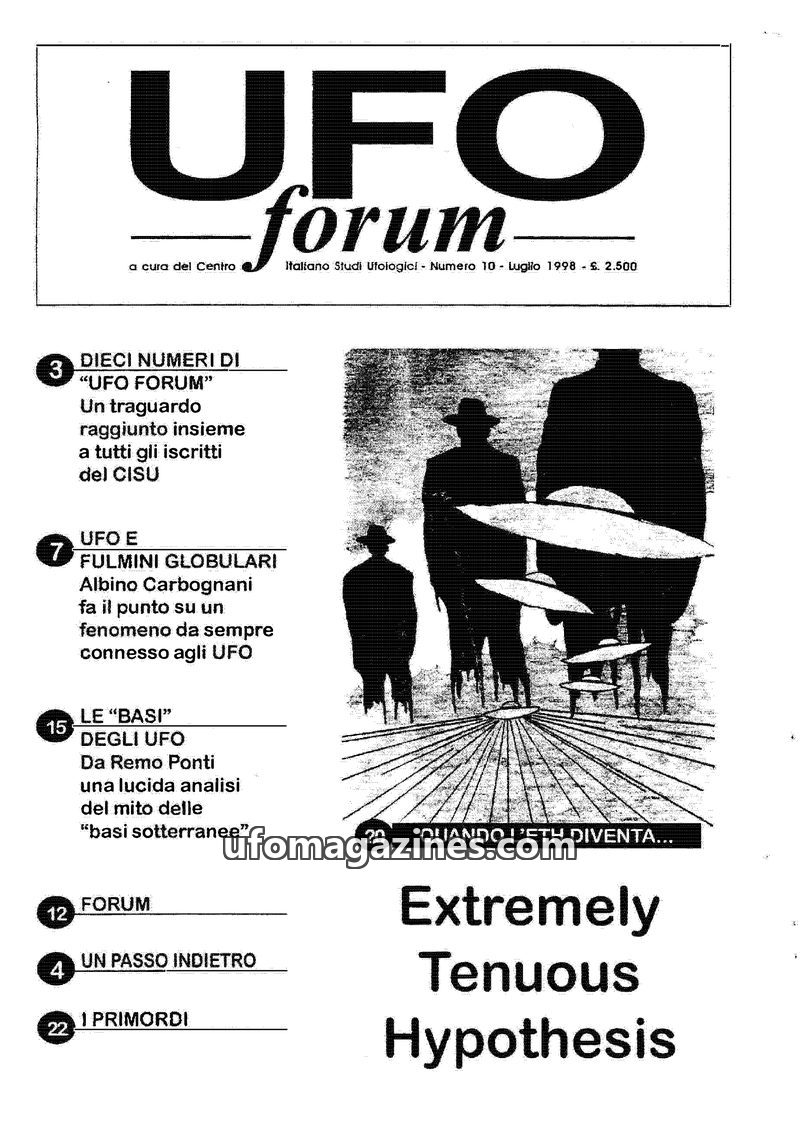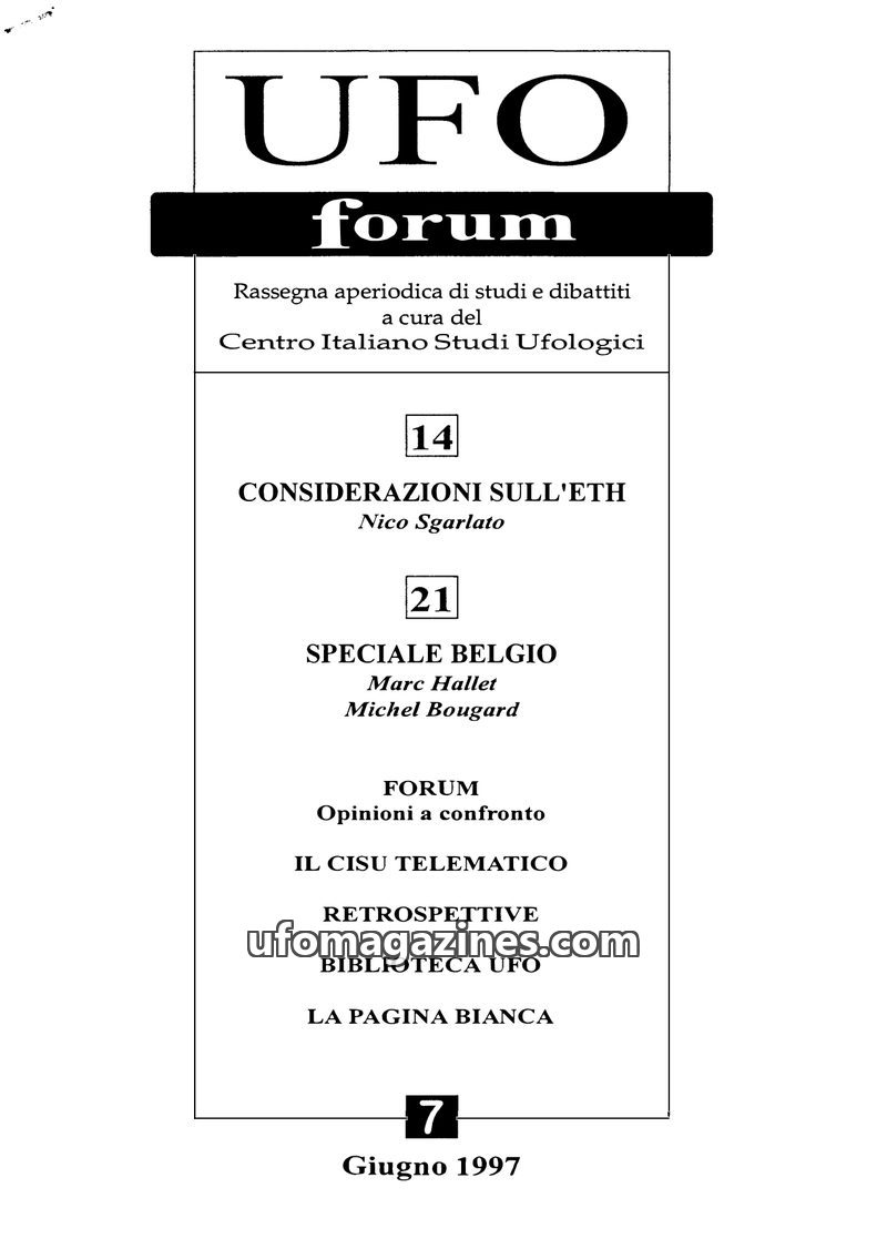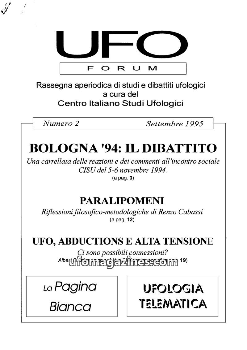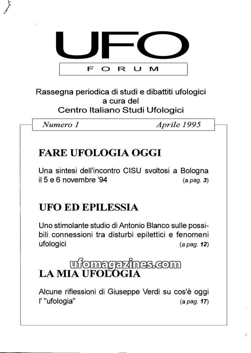 This inaugural issue of UFO Forum, published by the Centro Italiano Studi Ufologici (CISU) in April 1995, stems from a November 1994 meeting in Bologna. The issue focuses on the cu