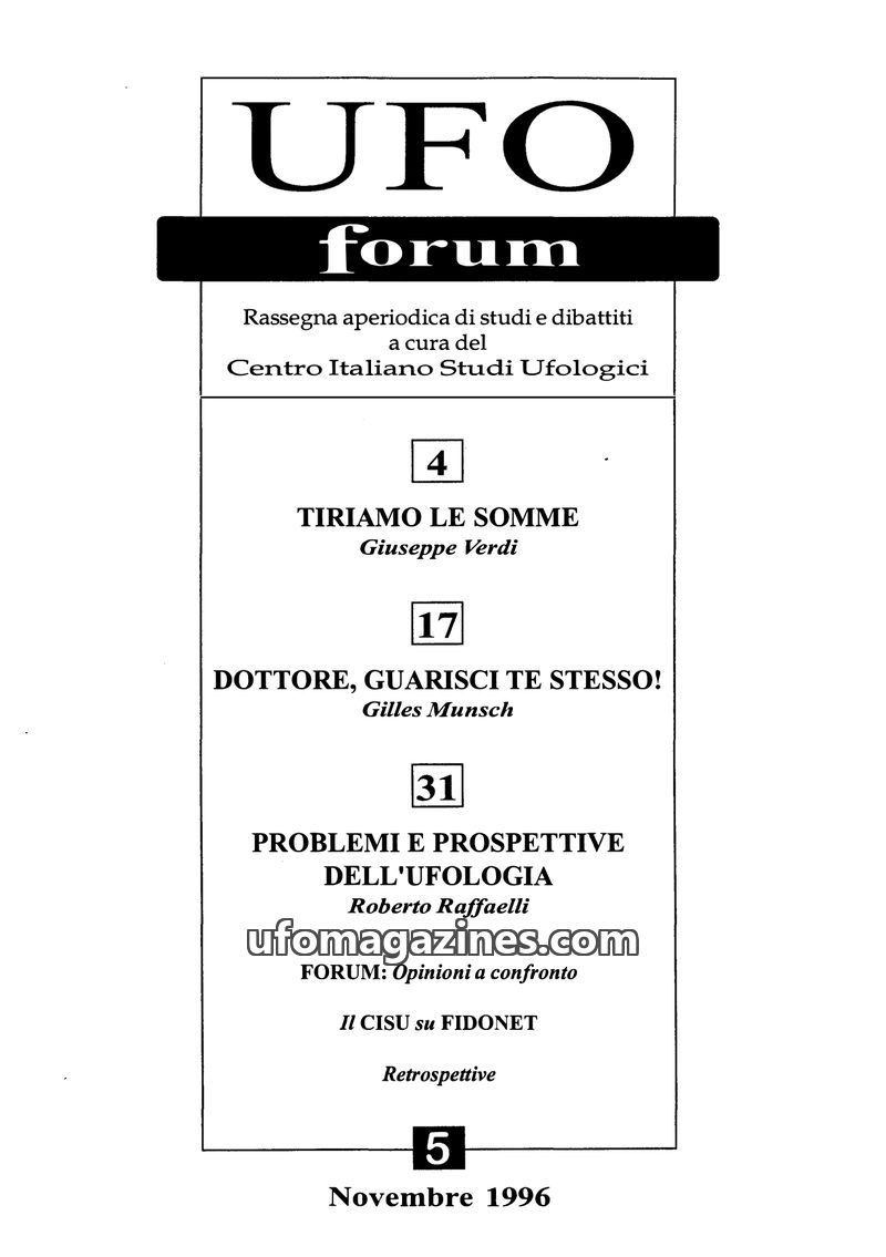This issue of UFO Forum, dated November 1996, focuses on consolidating discussions and exploring new avenues in ufology. Editor Giuseppe Verdi emphasizes the need for contributions