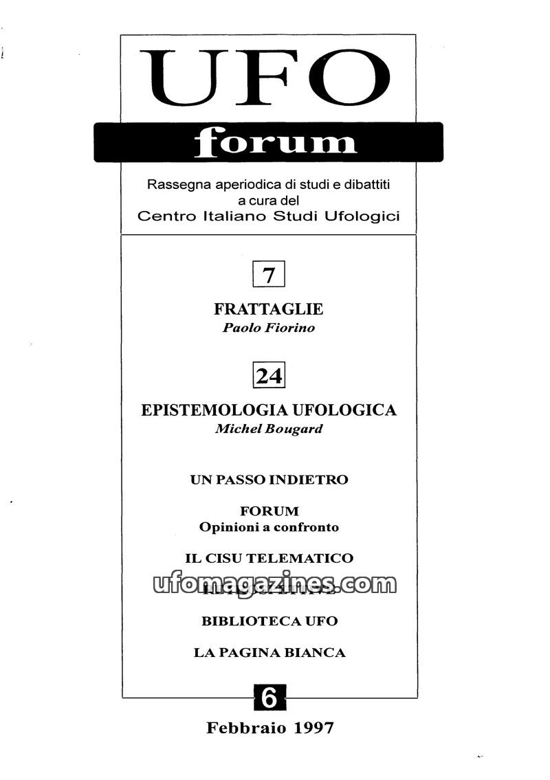 This issue of UFO Forum, number 6 from February 1997, marks its second year of publication. It introduces new columns, including 'Un passo indietro' by Marco Orlandi and 'Bibliotec