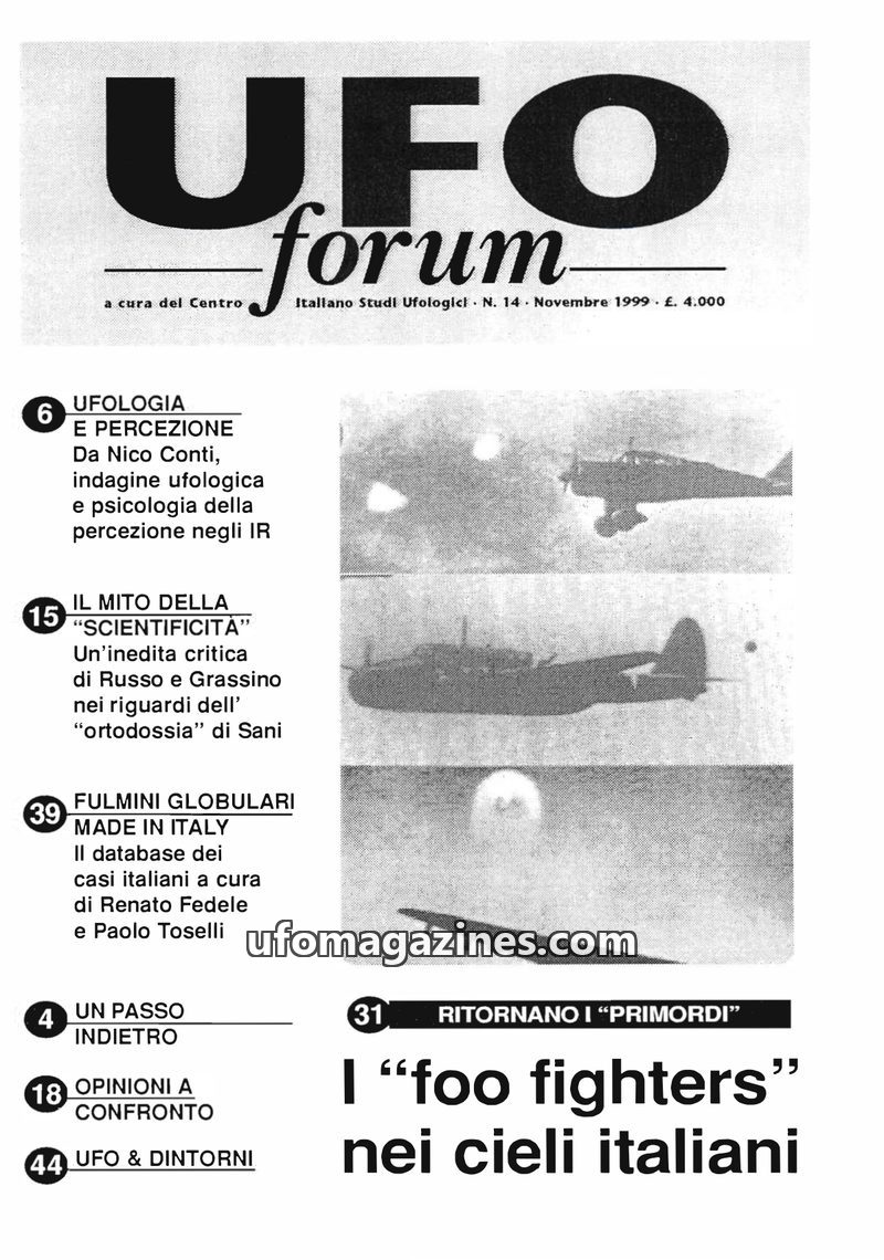 This issue of UFO Forum delves into the phenomenon of 'foo fighters' in Italian skies, examining their historical context and potential explanations. It also critically assesses th