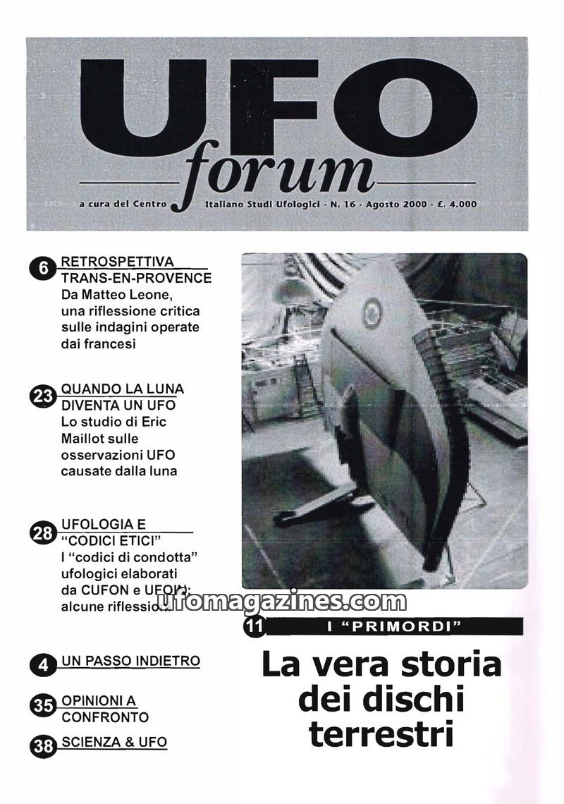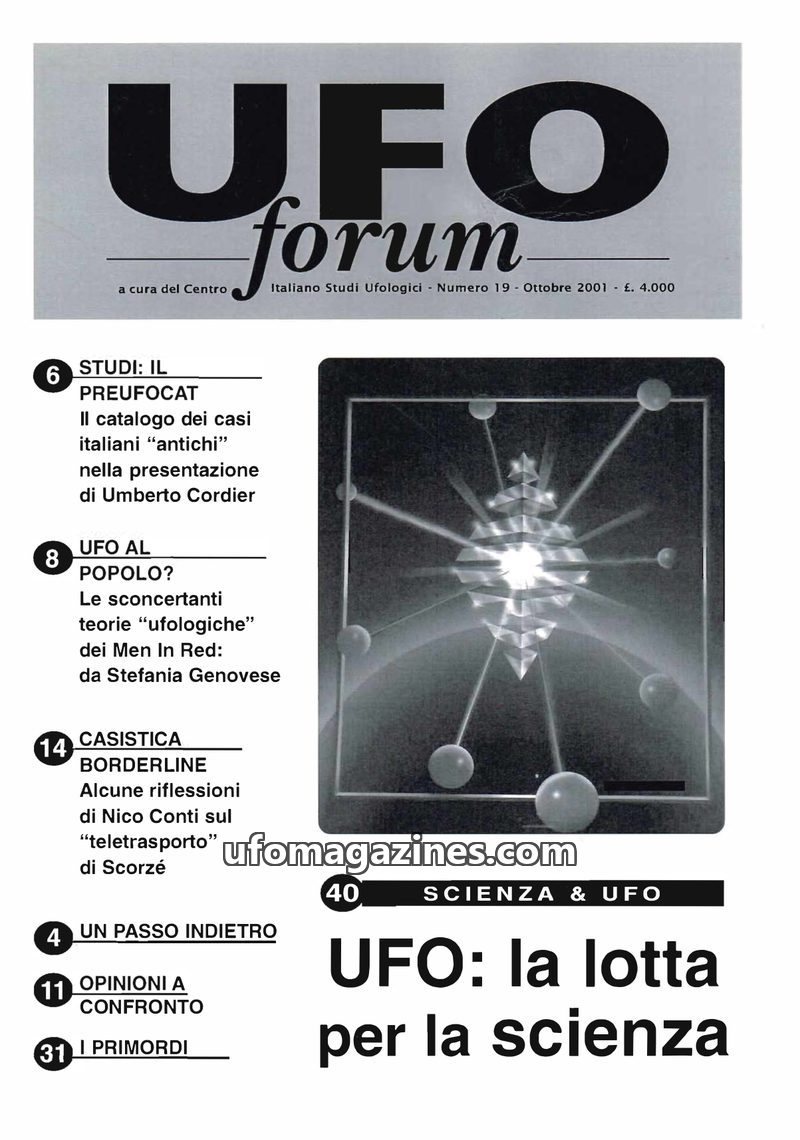 This issue of UFO Forum (October 2001) delves into the relationship between ufology and scientific disciplines. It features an editorial by Giuseppe Stilo discussing the return of