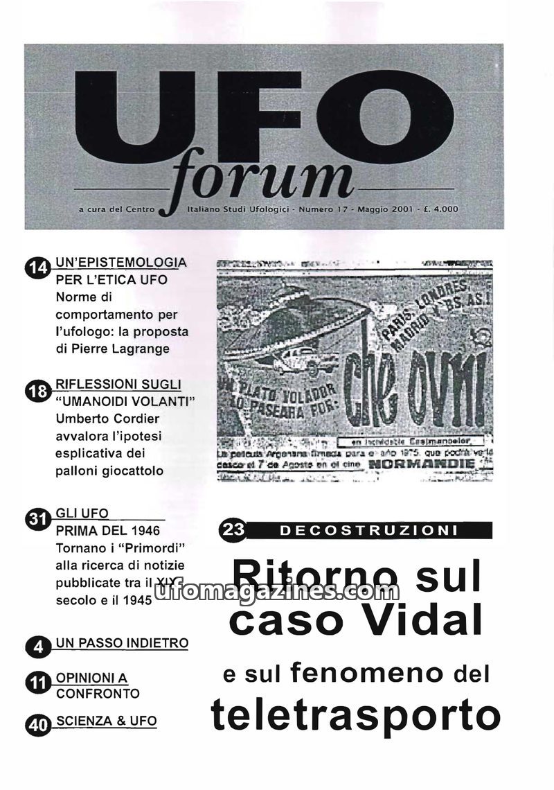 This issue of UFO Forum, dated May 2001, focuses on epistemological and ethical considerations in ufology, with a lead article by Pierre Lagrange. It delves into the 'Vidal case' a