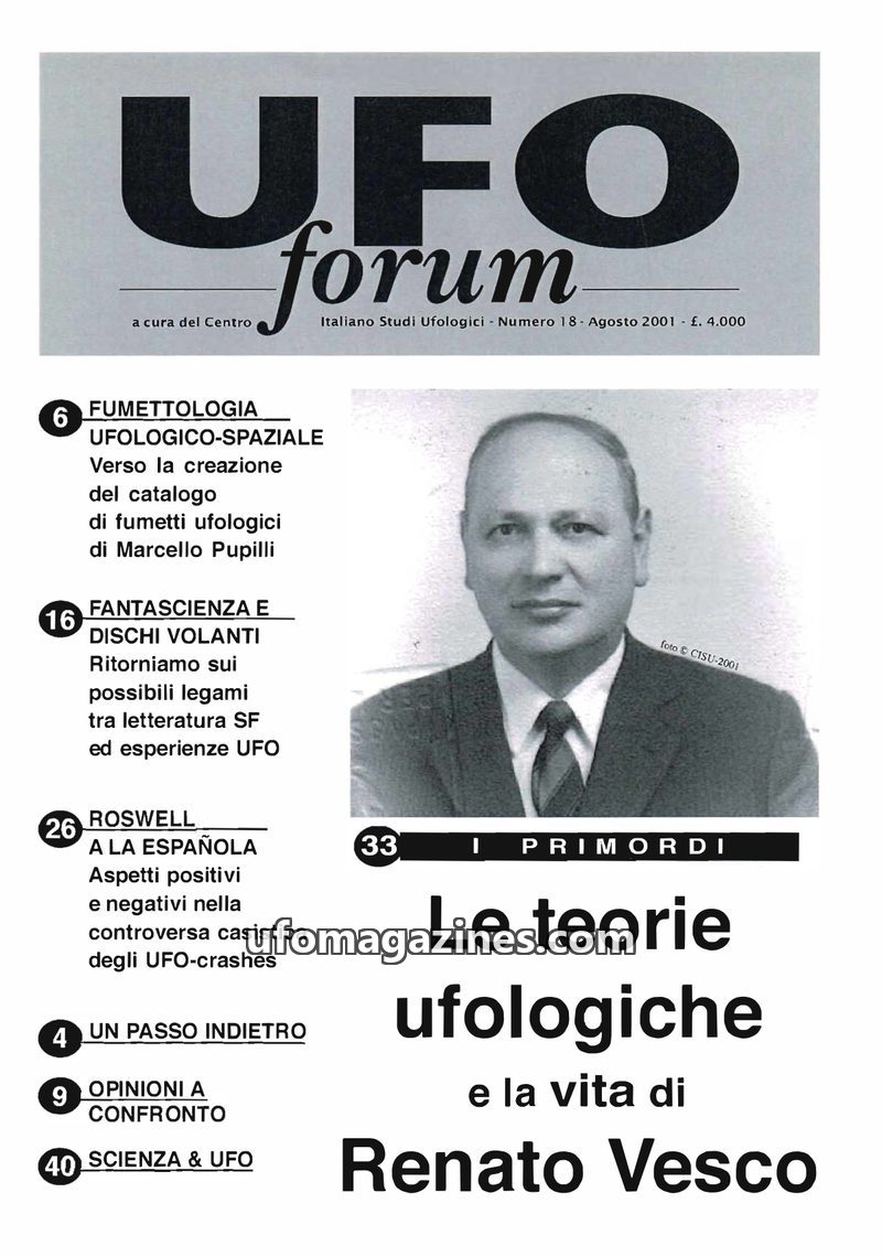 This issue of UFO Forum delves into various aspects of ufology, including a feature on the theories and life of Renato Vesco. It explores the connection between science fiction and