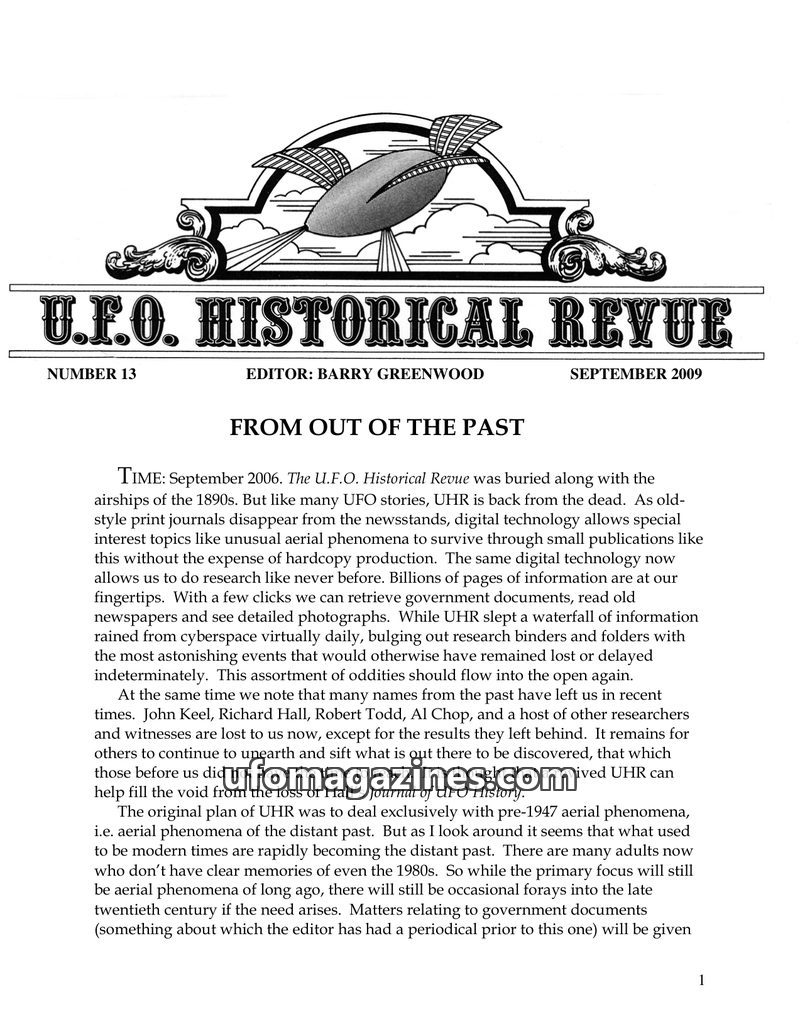 This issue of U.F.O. Historical Revue, revived through digital means, focuses on historical aerial phenomena and government documents. It discusses the Ramey Memo, analyzing its co
