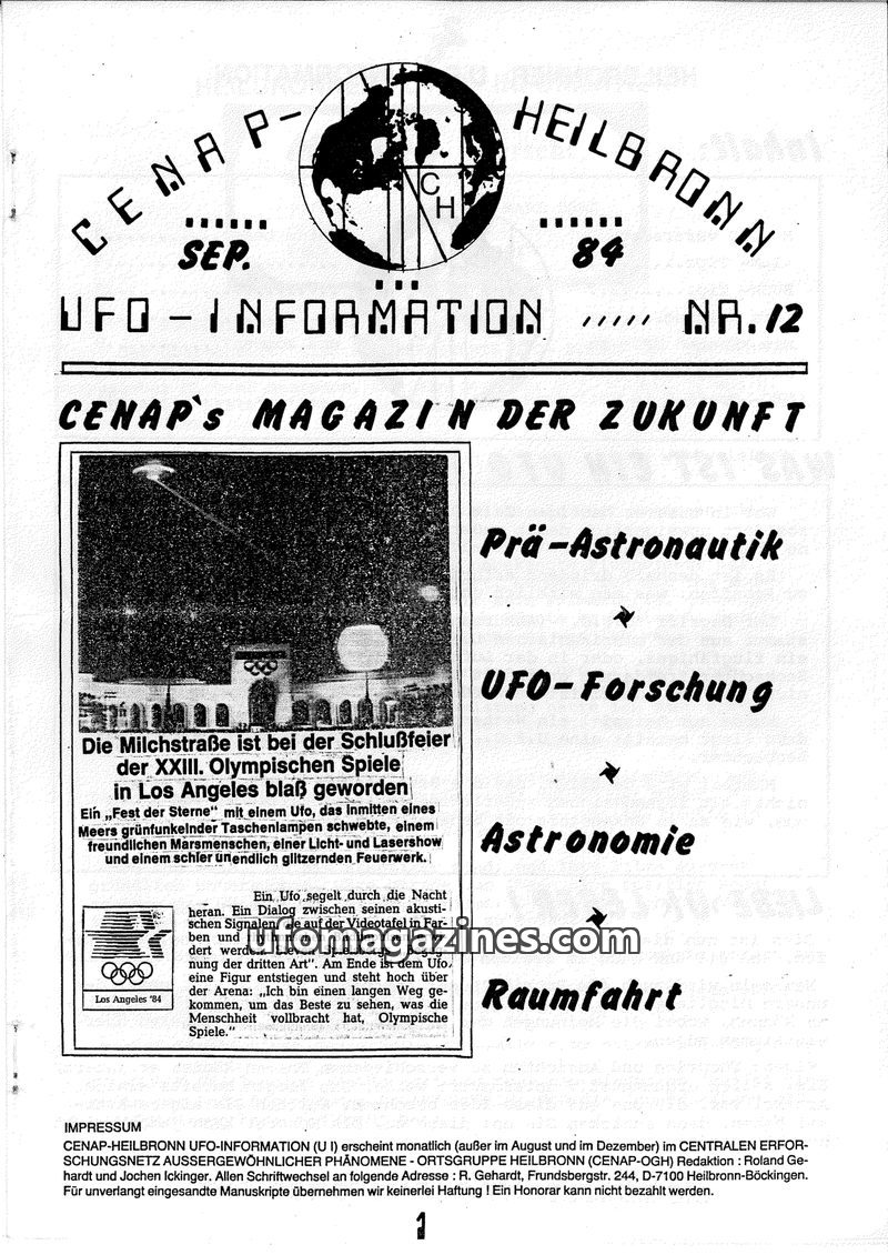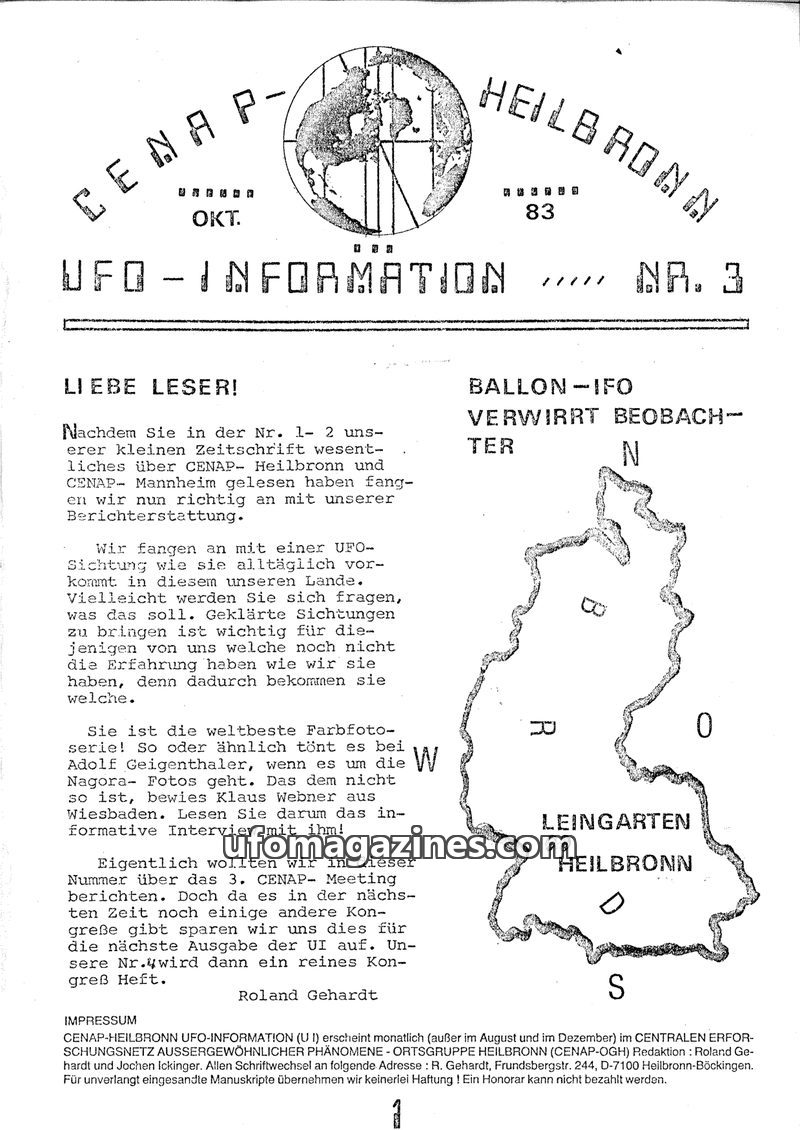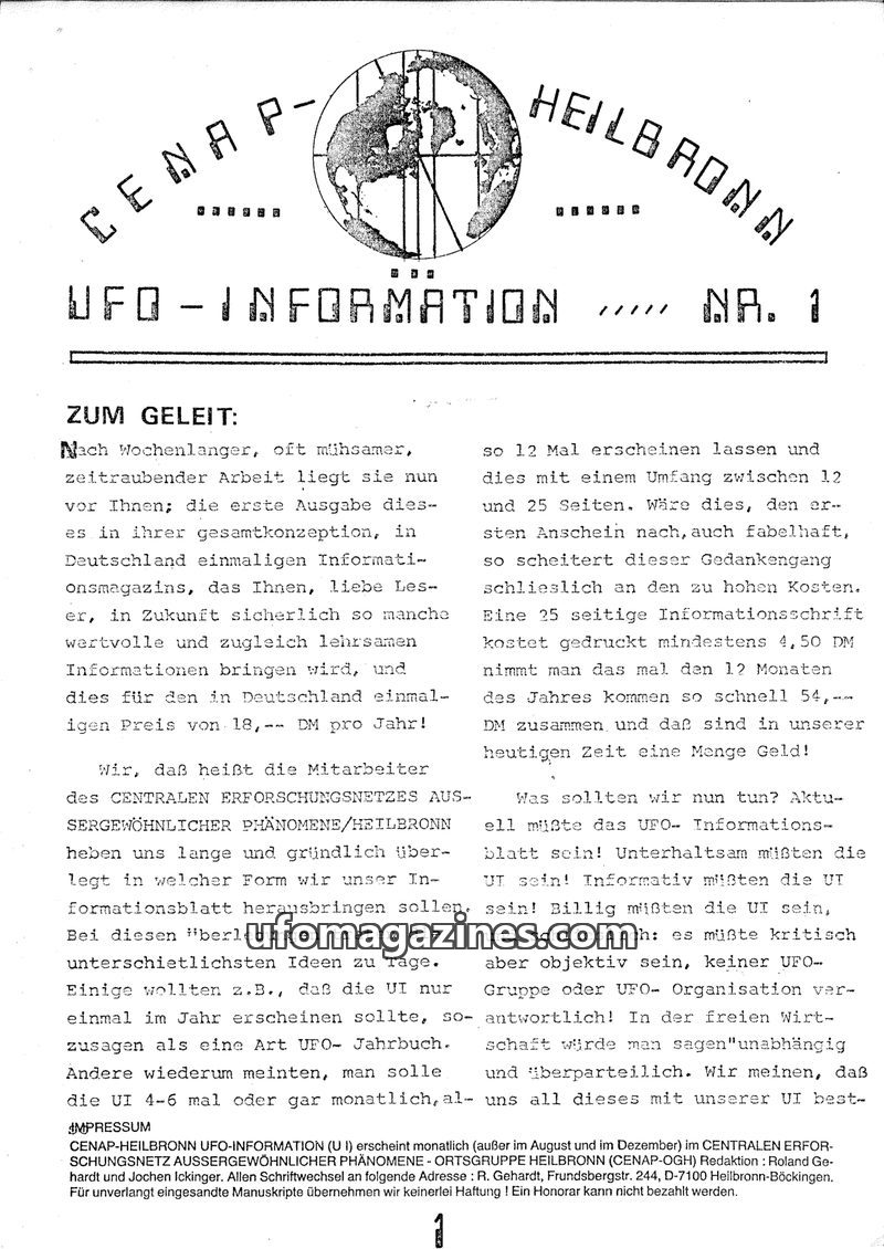 This is the inaugural issue of 'Heilbronner UFO Information' (UI), a new German magazine dedicated to UFO research. The editors, Roland Gehardt and Jochen Ickinger, aim to provide