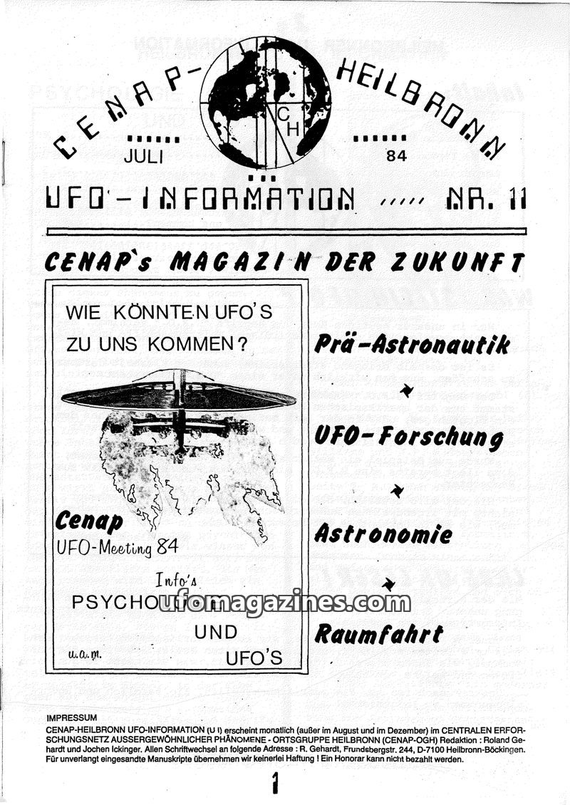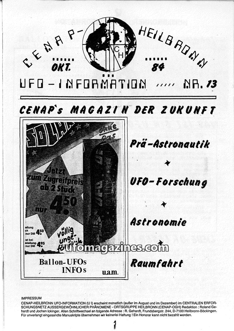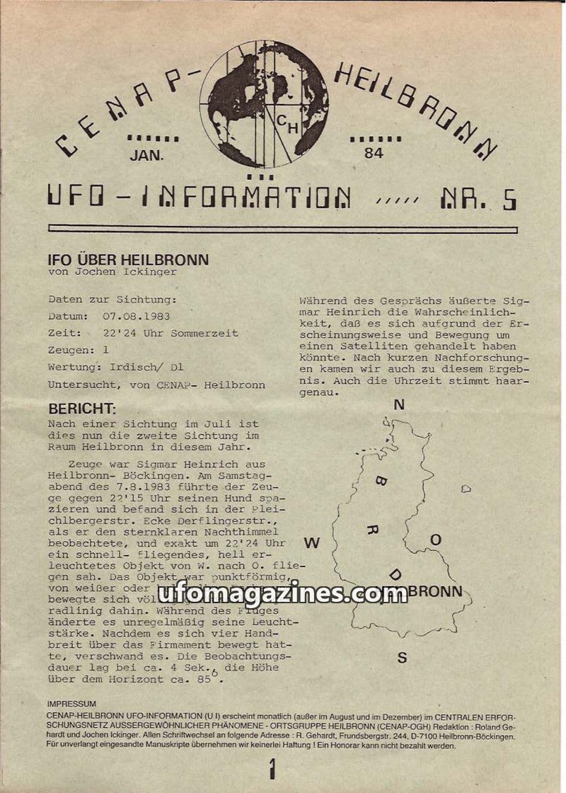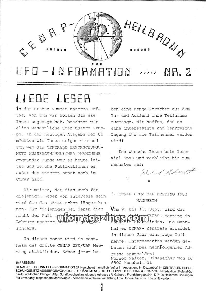 This issue of Heilbronner UFO Information (Issue 2) focuses on the CENAP (CENTRALE ERFORSCHUNGSNETZ AUSSERGEWÖHNLICHER PHÄNOMENE) organization. It details CENAP's founding in 1973