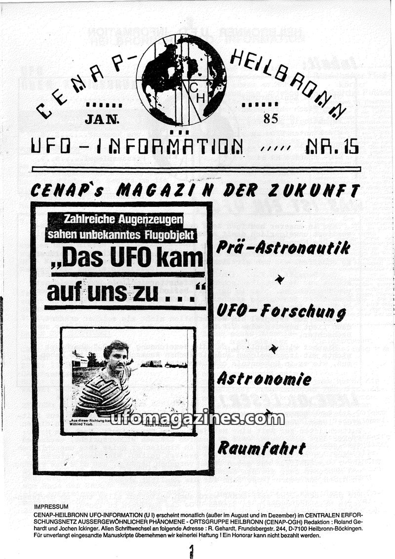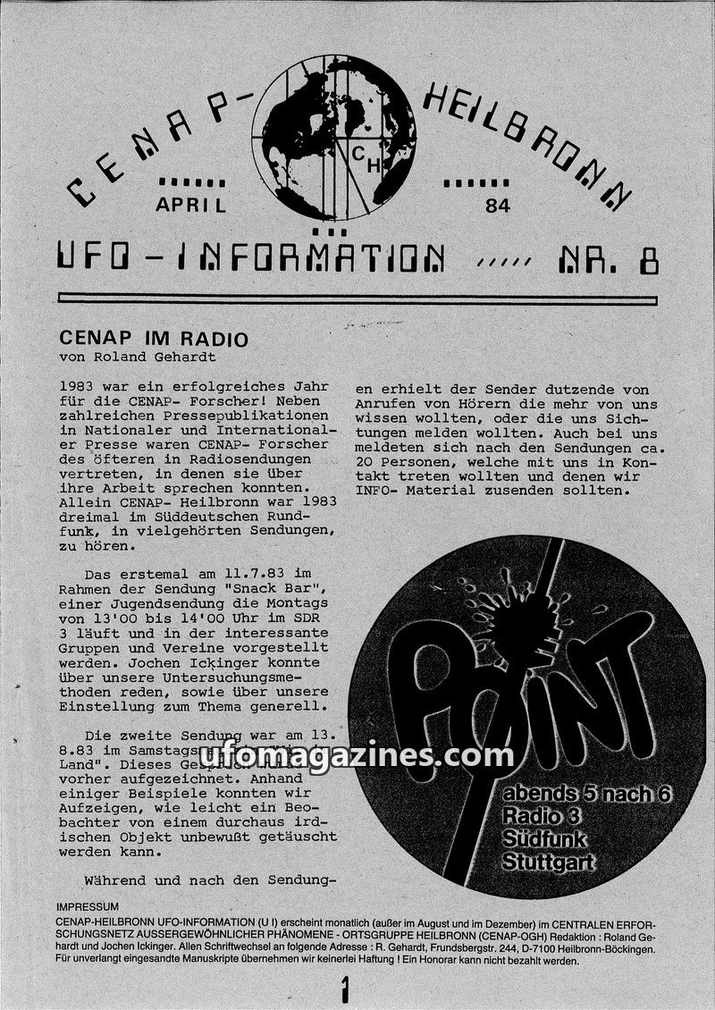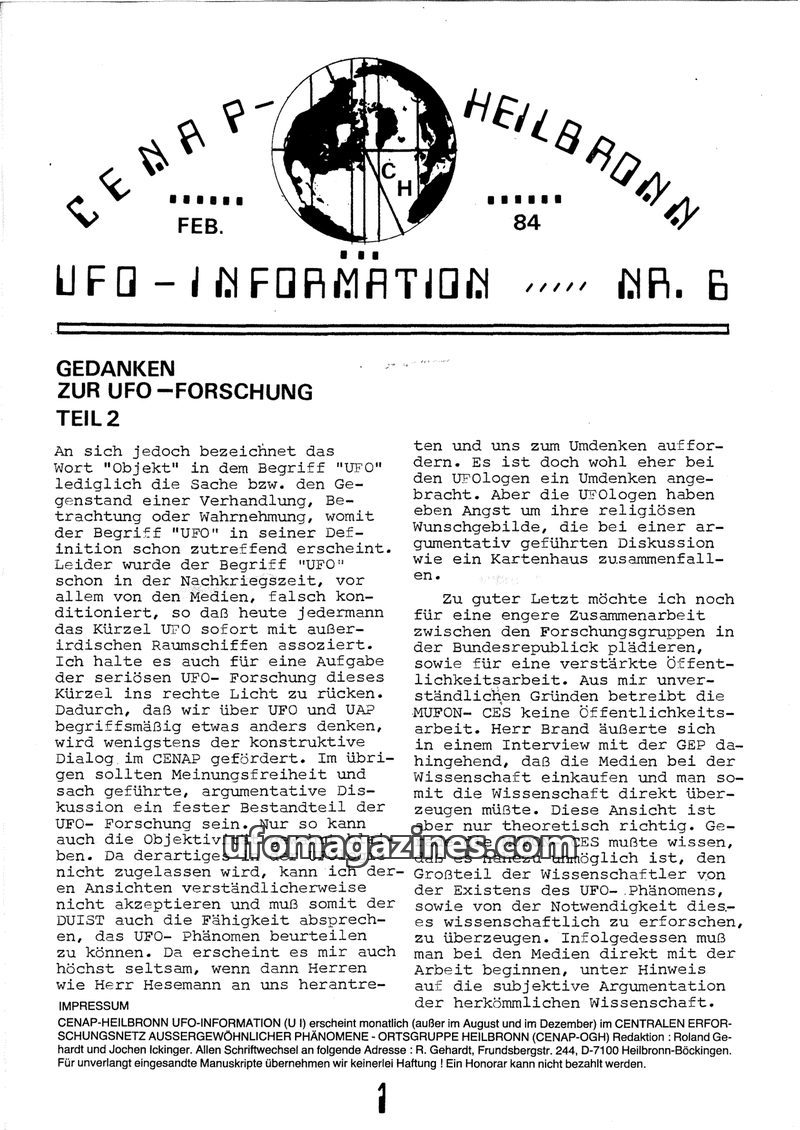 This issue of Heilbronner UFO Information (Issue 2) focuses on the CENAP (CENTRALE ERFORSCHUNGSNETZ AUSSERGEWÖHNLICHER PHÄNOMENE) organization. It details CENAP's founding in 1973
