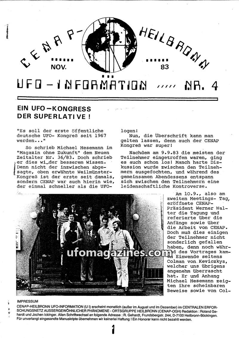 This issue of Heilbronner UFO Information reports on the CENAP UFO Congress held in Heilbronn in September 1983, highlighting it as a significant event in German UFOlogy. The congr
