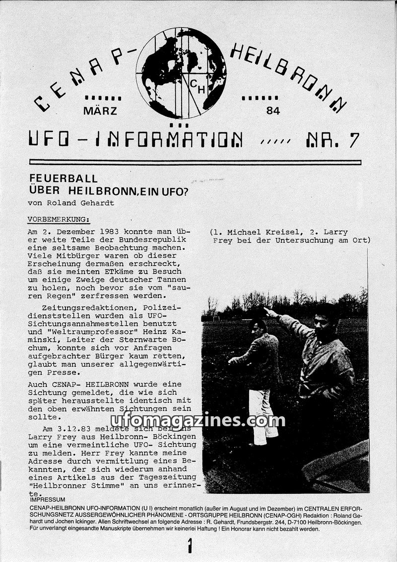 This issue of Heilbronn UFO Information (March 1984) details a significant sighting of a fiery sphere over Heilbronn on December 2, 1983, observed by multiple witnesses and investi