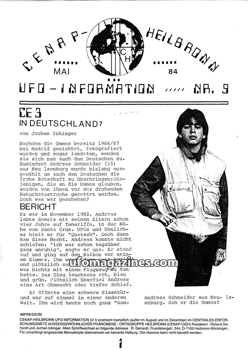 This issue of Heilbronner UFO Information focuses on the case of Andreas Schneider, a 15-year-old from Neu Isenburg, who claims to have been contacted by beings from the planet 'Hu