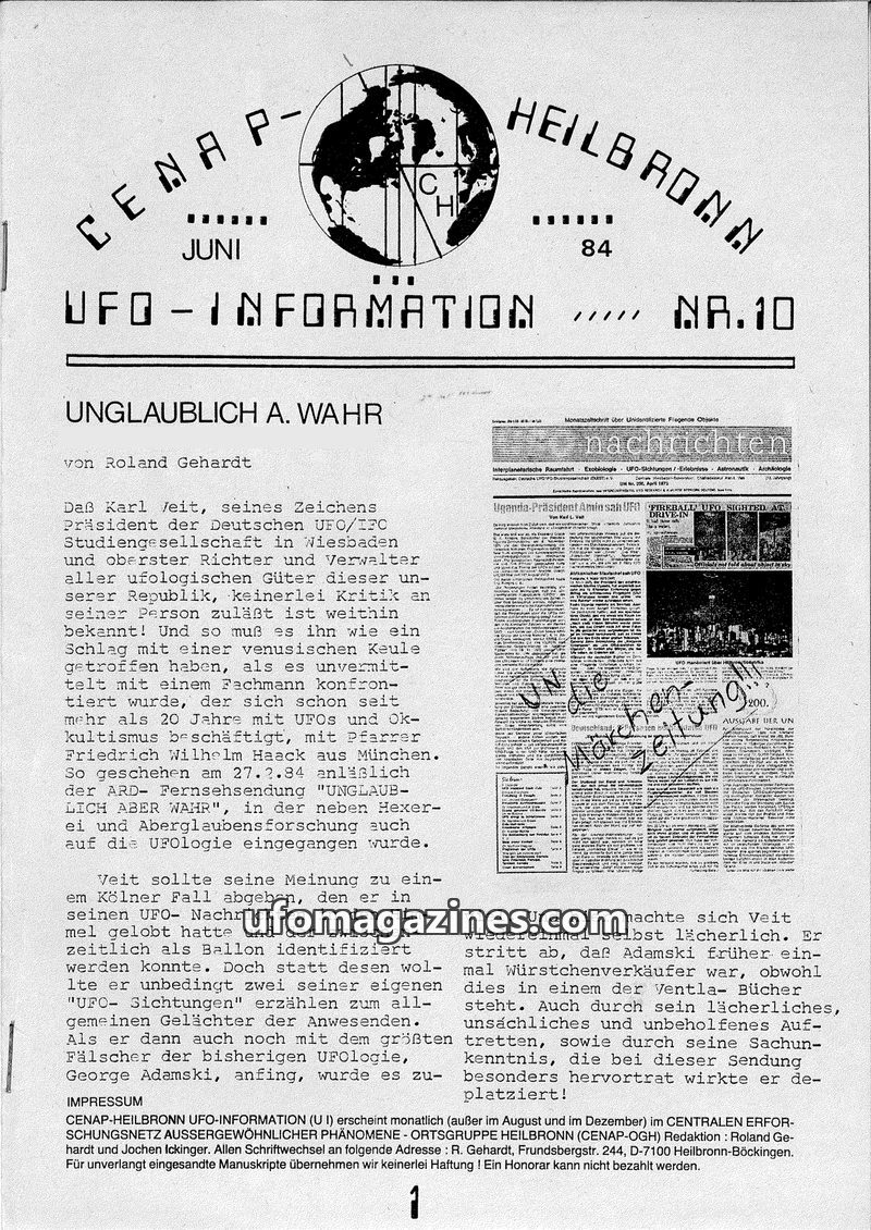 This issue of Heilbronner UFO Information critically examines Karl Weit's public persona and UFO research, contrasting his claims with documented cases. It delves into the history