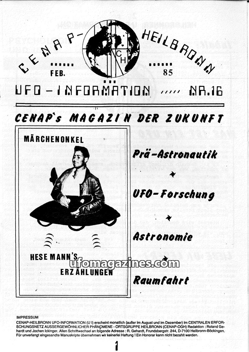This issue of Heilbronner UFO Information (Nr. 16, Feb 1985) delves into the psychological aspects of UFO sightings, emphasizing how witness perception, memory, and suggestibility