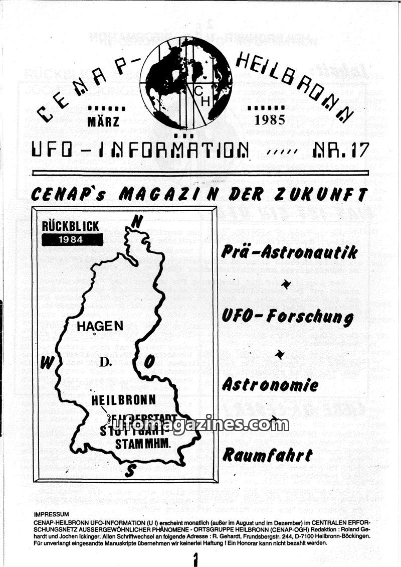 This issue of Heilbronner UFO Information (Nr. 17, March 1985) provides a look back at UFO events in 1984 with detailed reports on sightings in Stammheim, Hagen, and Filderstadt. I