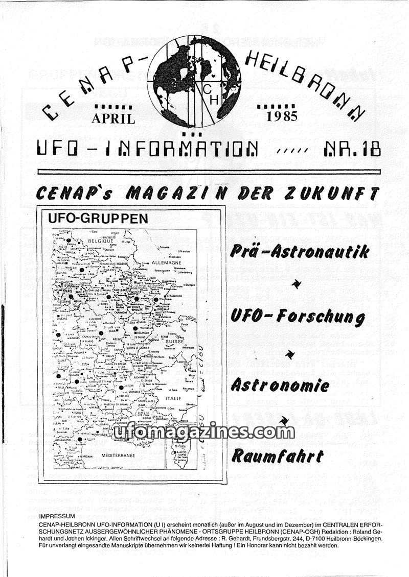This issue of Heilbronner UFO Information from April 1985 focuses on UFO groups, particularly the French CNEGU network, and delves into topics like Prä-Astronautik, UFO research, a