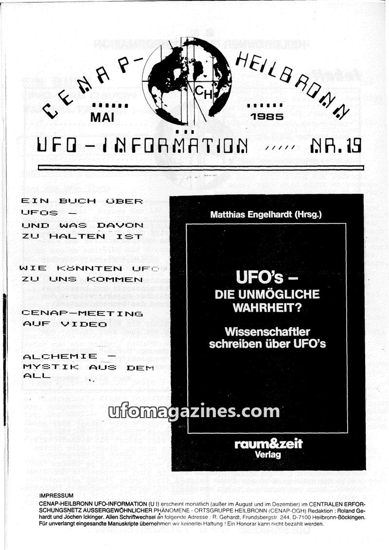 This issue of Heilbronner UFO Information (Nr. 19, May 1985) critically reviews the book "UFOs - Die Unmögliche Wahrheit?", questioning the claims made by its contributors and high