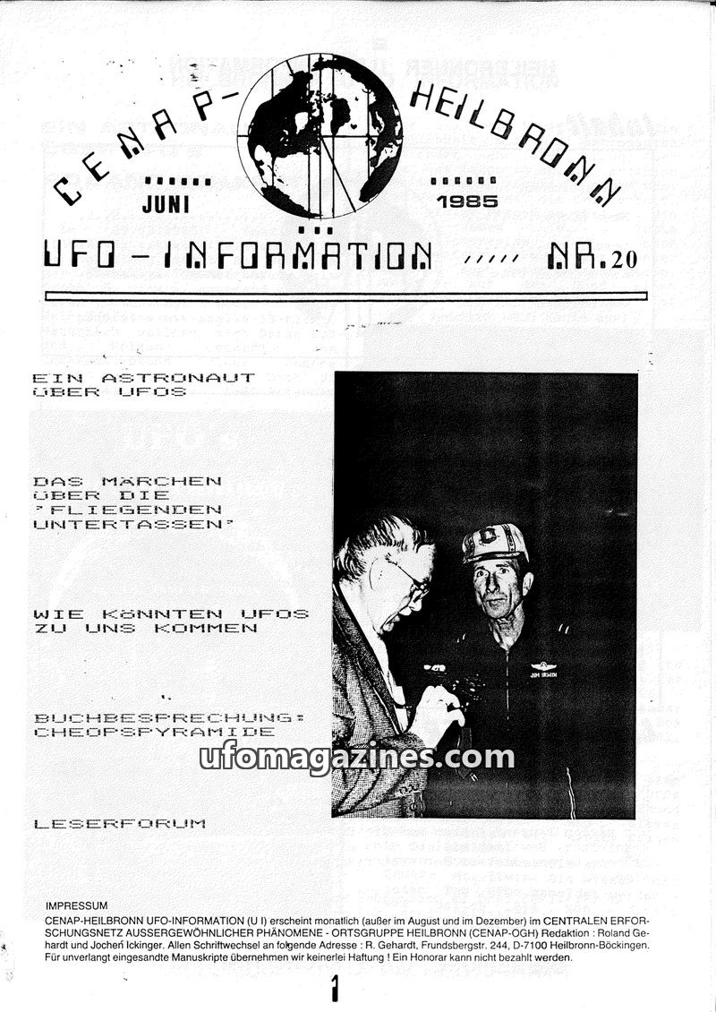 This issue of Heilbronner UFO Information (June 1985, Nr. 20) features an interview with former US astronaut James B. Irwin, who discusses UFO sightings and his views on the phenom