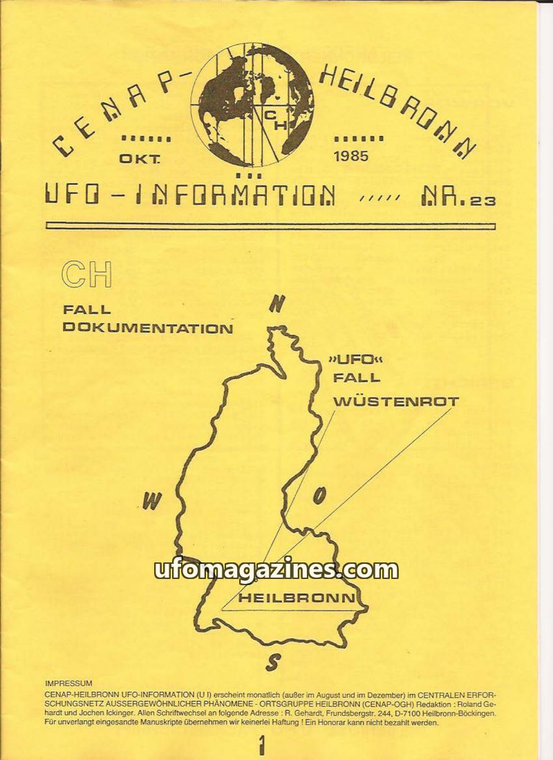 This issue of Heilbronner UFO Information details a sighting on January 25, 1985, near Wüstenrot, Germany. The witness described a silent, boot-shaped object, the size of a car, fl
