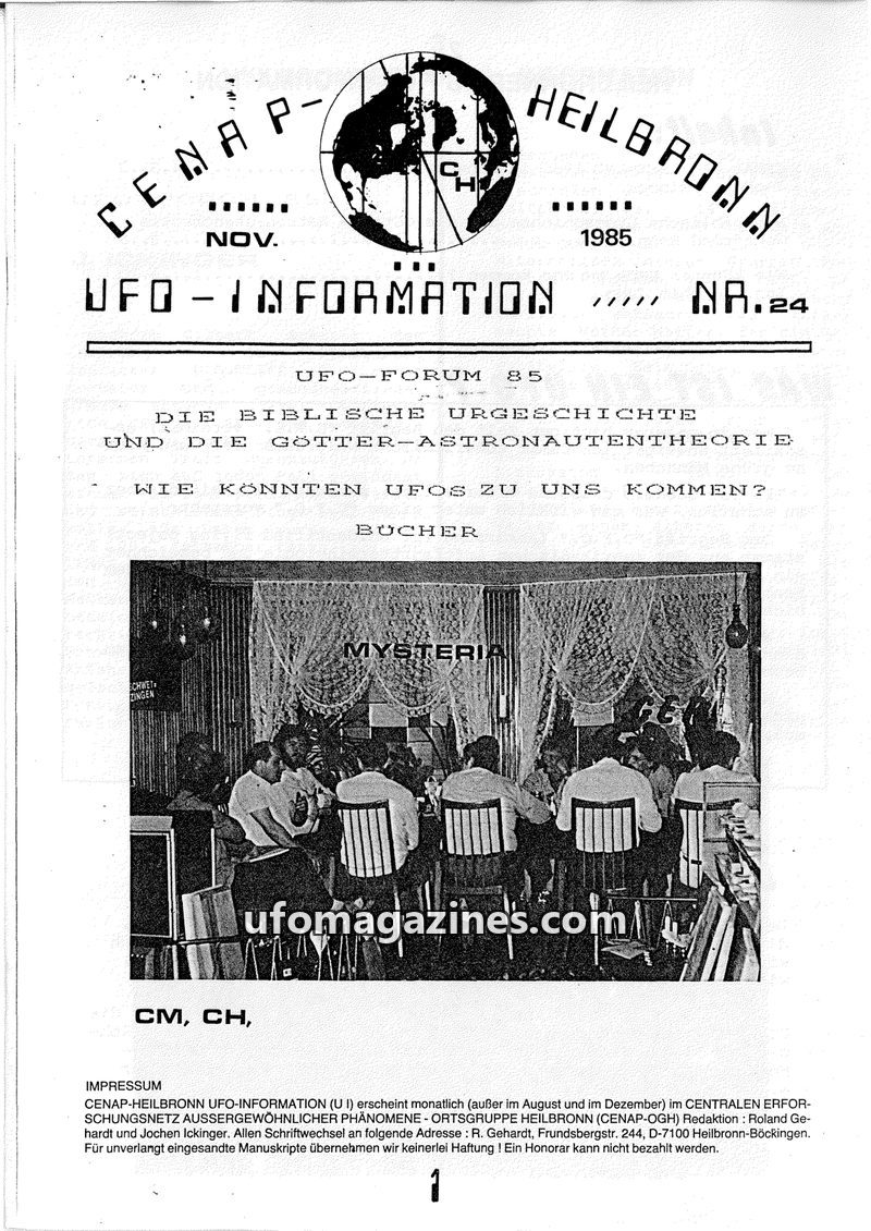 This issue of Heilbronner UFO Information (No. 24, November 1985) focuses on the intersection of biblical history and ancient astronaut theories, particularly examining the Book of
