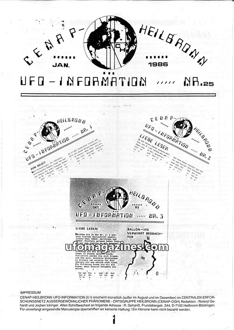 This issue of Heilbronner UFO Information, dated January 1986, marks the 25th edition and the end of its monthly publication due to editorial and personal commitments. It includes
