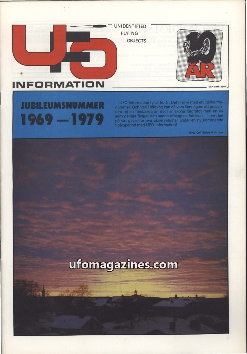 This 10th-anniversary issue of UFO Information (1969-1979) celebrates a decade of documenting UFO phenomena in Sweden. It features several detailed witness accounts of sightings an