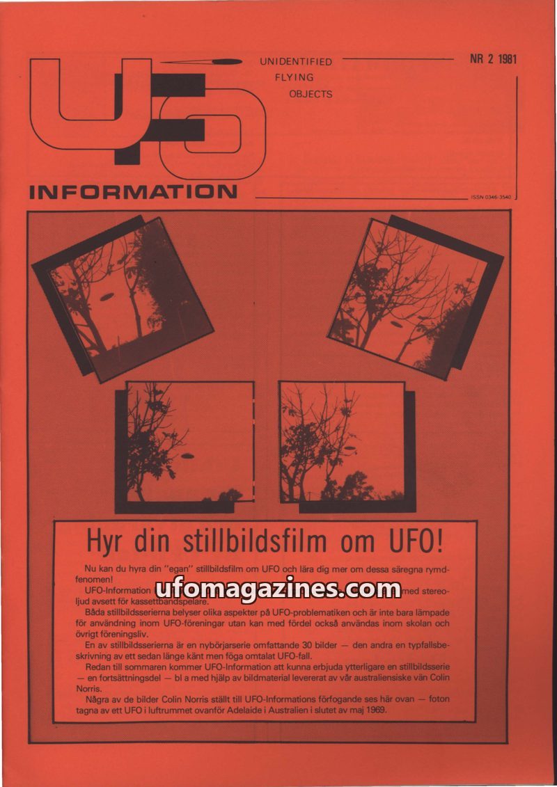 This issue of UFO-Information from 1981 focuses on UFO sightings and evidence, particularly films. It details a significant sighting in Holmestad, Sweden, in October 1978, involvin