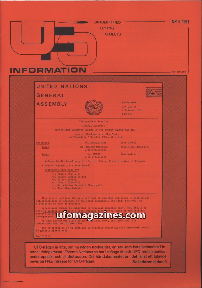 This issue of UFO-Information from 1981 delves into UFO phenomena, featuring a UN General Assembly discussion on the topic and numerous case studies. It details various types of hu