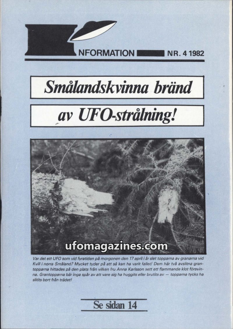 This issue of UFO-Information from 1982 details a case in Kvill, Småland, where Anna Karlsson reported being burned by radiation from a UFO. The magazine also includes numerous oth
