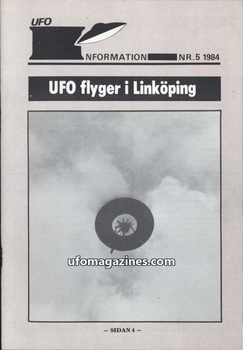 This issue of UFO-INFORMATION features a cover story on UFO sightings in Linköping, with a model aircraft resembling a flying saucer. It includes detailed eyewitness accounts of UF