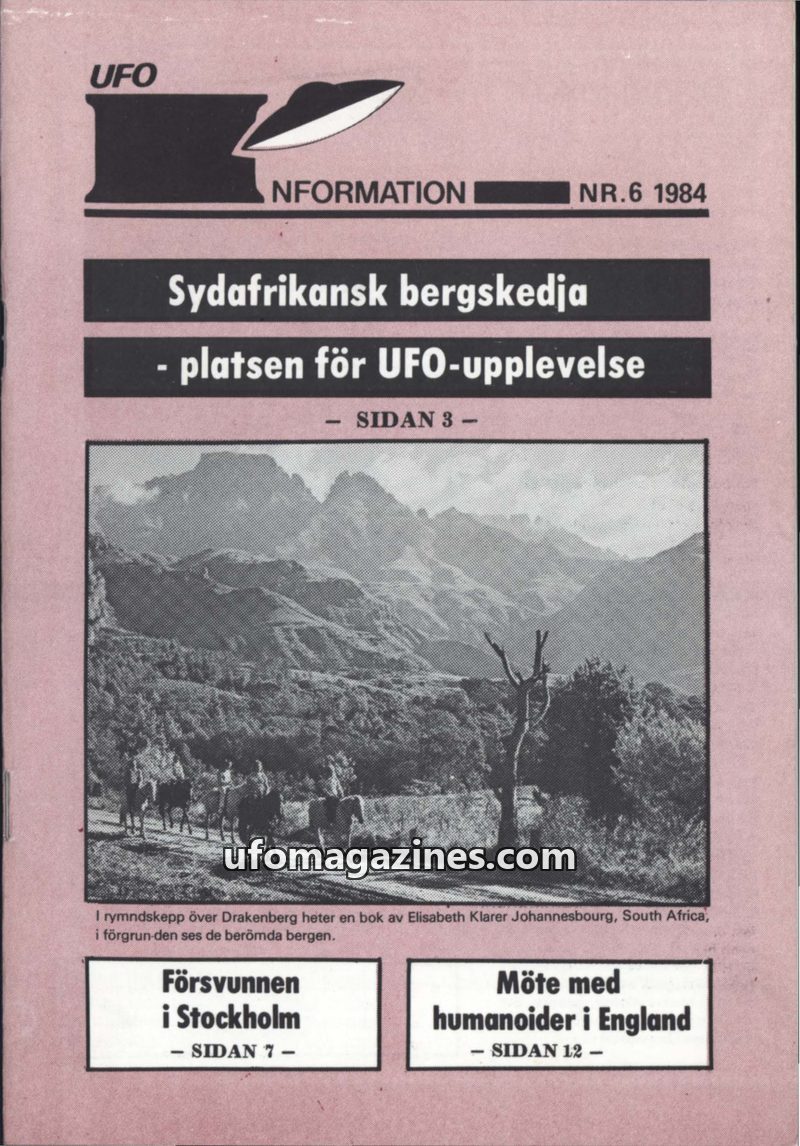 This issue of UFO Information (NR.6 1984) features a cover story on UFO experiences in the South African Drakensberg mountains, linked to Elisabeth Klarer's book and a visit from a