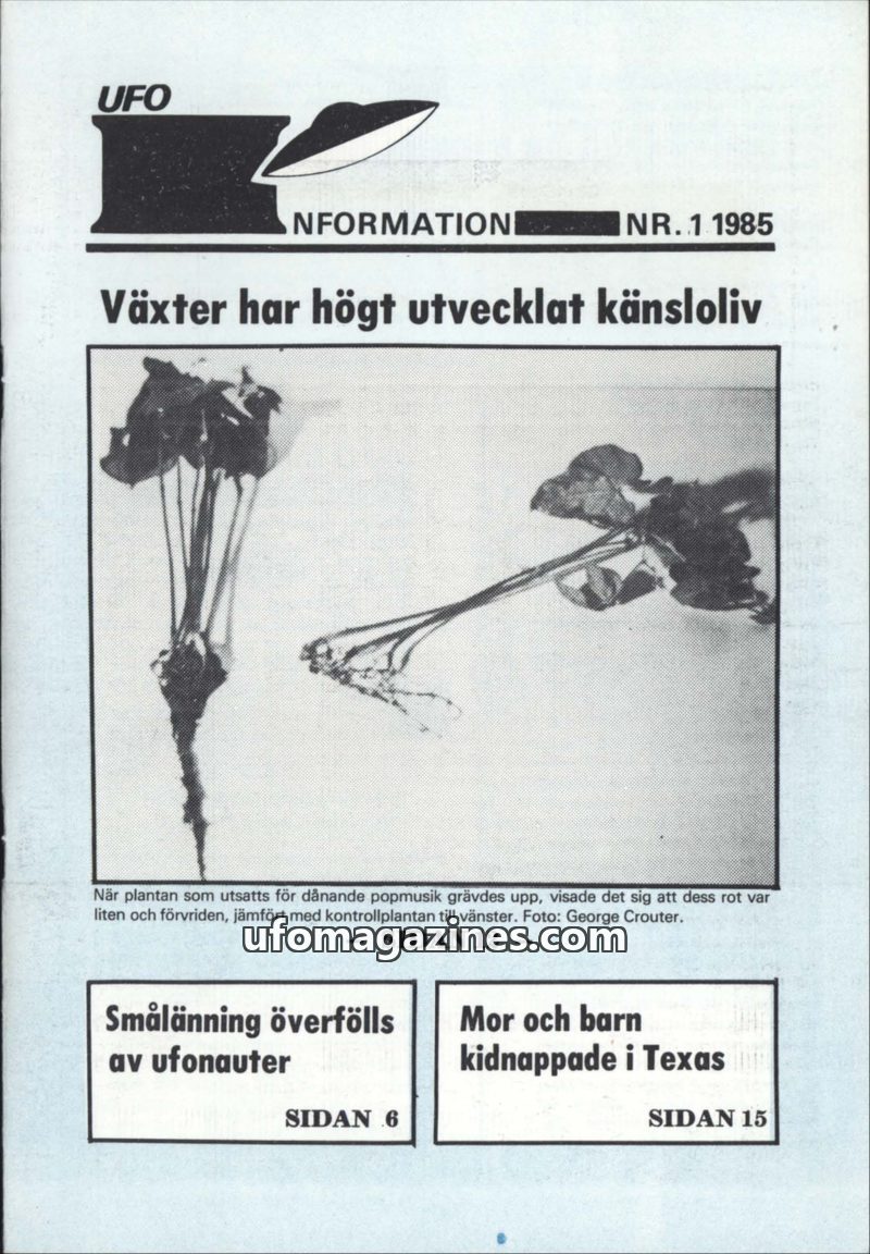 This issue of UFO-Information explores the heightened emotional lives of plants, citing experiments by Dorothy Retallack and Francis Broman, and Cleve Backster's polygraph studies.