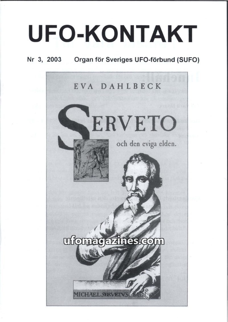 This issue of UFO-KONTAKT, Nr 3, 2003, focuses on the life and persecution of Michael Serveto, a Spanish humanist and theologian. The magazine delves into the historical suppressio