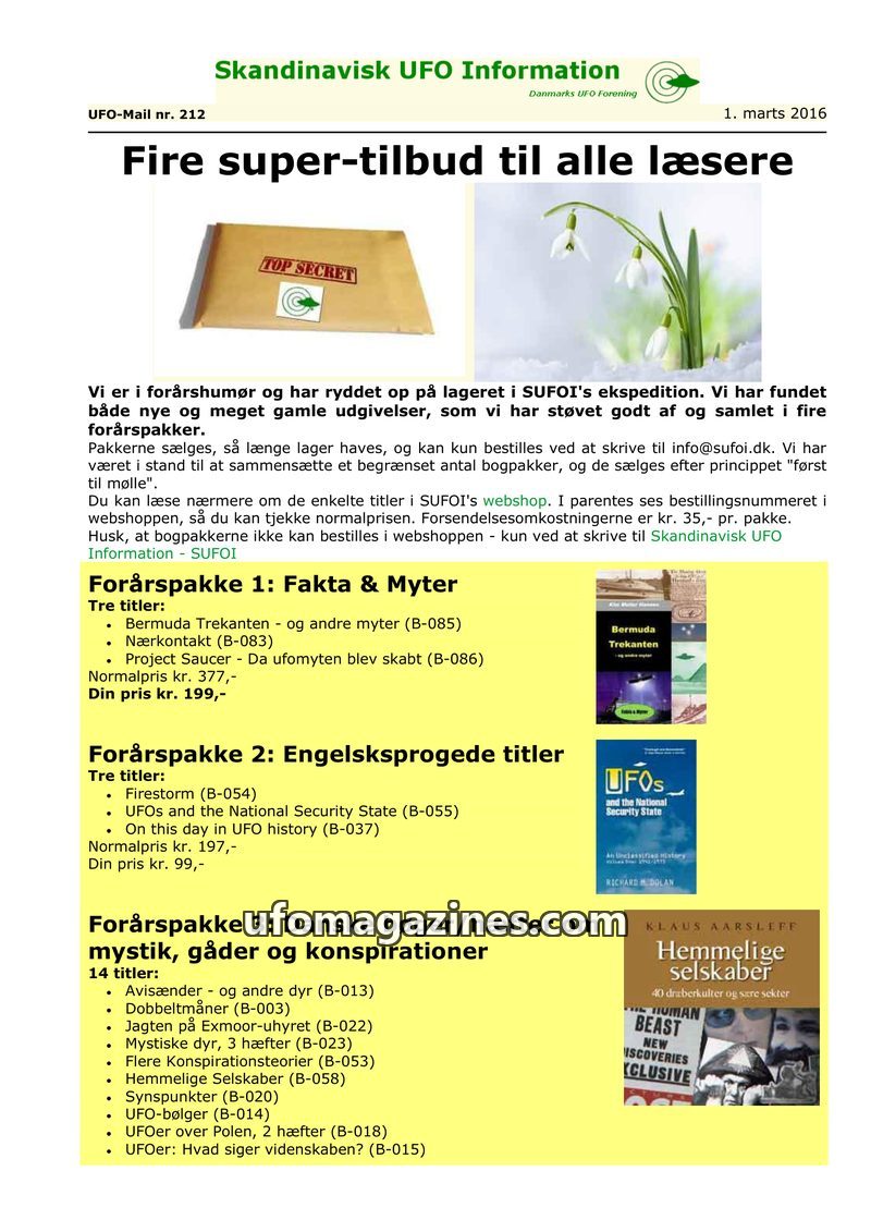This issue of Skandinavisk UFO Information features special 'spring package' offers on various books and booklets related to UFOs, mysteries, and conspiracy theories. The magazine