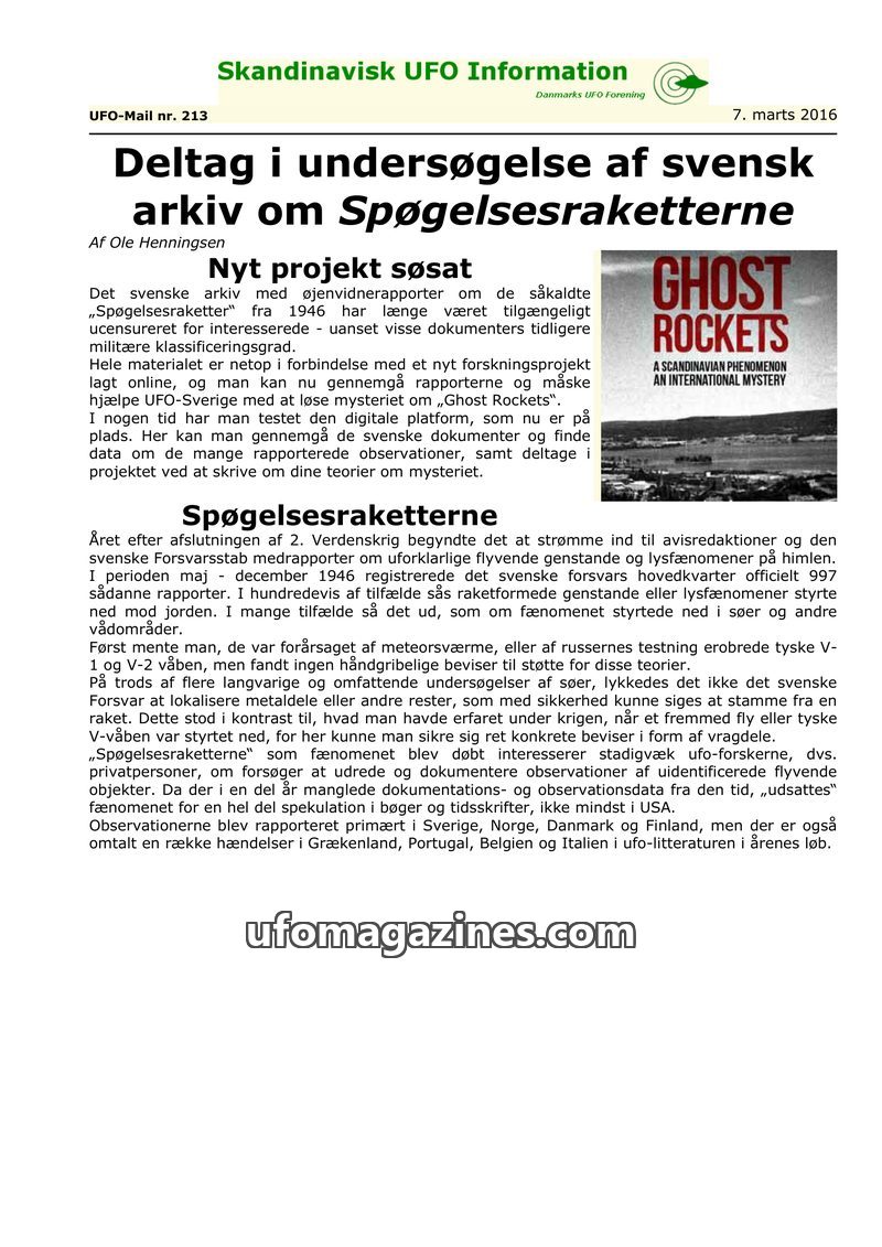 This issue of Skandinavisk UFO Information focuses on the 'Ghost Rockets' phenomenon, particularly the Swedish archives from 1946. A new project has digitized these archives, allow