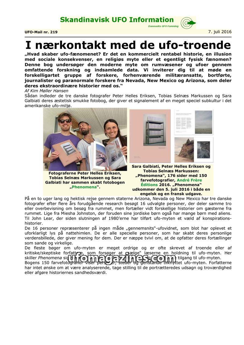 This issue of Skandinavisk UFO Information reviews the photo book 'Phenomena' by Danish photographers Peter Helles Eriksen, Tobias Selnæs Markussen, and Sara Galbiati, which docume