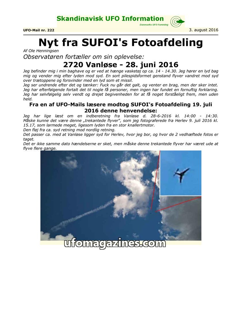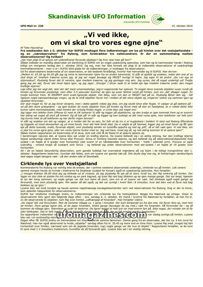 This issue of Skandinavisk UFO Information reports on a sighting of three red, luminous objects over Hillerød, Denmark, on August 16, 2016, observed by a pensioner. The objects mov
