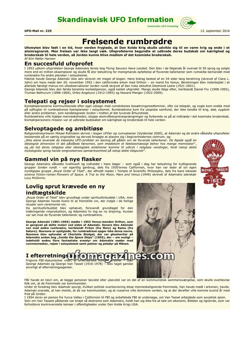 This issue of Skandinavisk UFO Information, dated September 2016, delves into the origins of UFO mythology, focusing on George Adamski and his book 'Flying Saucers Have Landed'. It